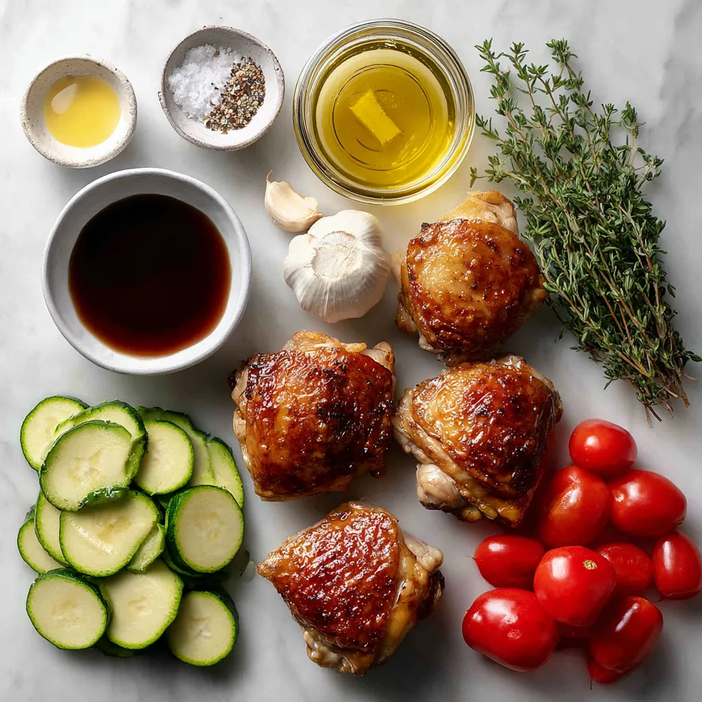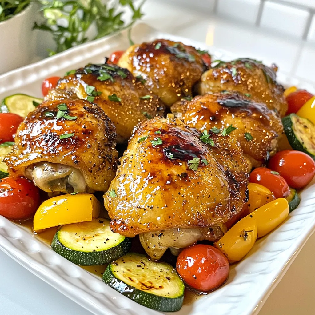 - 4 bone-in chicken thighs, skin-on - 1/2 cup balsamic vinegar - 1/4 cup honey - 3 cloves garlic, minced - 1 tablespoon Dijon mustard - 2 teaspoons fresh thyme leaves (or 1 teaspoon dried thyme) - Salt and pepper, to taste - 2 tablespoons olive oil - 1 zucchini, sliced into rounds - 1 bell pepper, sliced - 1 cup cherry tomatoes Measuring ingredients helps keep your dish consistent. Use measuring cups and spoons for accuracy. For liquids, pour carefully to avoid spills. For dry ingredients, scoop and level them off. Always check your measurements twice. This will help you get the flavors just right. {{ingredient_image_1}} To make the marinade, start by whisking together the balsamic vinegar, honey, minced garlic, Dijon mustard, thyme, salt, and pepper in a bowl. This mix gives the chicken a sweet and tangy flavor. You need to marinate the chicken for at least 30 minutes. For the best taste, marinate it for 2 hours. This time lets the flavors soak into the meat. Next, preheat your oven to 400°F (200°C). This temperature cooks the chicken evenly. While the oven heats, grab an oven-safe skillet and heat olive oil over medium-high heat. This oil helps the chicken brown nicely. Make sure to remove the chicken from the marinade. Let any extra marinade drip off before placing the chicken in the skillet. Now it’s time to sear the chicken thighs. Place them skin side down in the skillet. Sear them for about 5-7 minutes until the skin turns golden brown. After that, flip the chicken thighs. Add the sliced zucchini, bell pepper, and cherry tomatoes around the chicken in the skillet. Pour the reserved balsamic marinade over everything. Transfer the skillet to your preheated oven. Bake for about 25-30 minutes. The chicken should reach an internal temperature of 165°F (75°C) to be safe to eat. For a crispy skin, switch the oven to broil mode. Broil for an extra 3-5 minutes, but watch closely to avoid burning. Once done, let the chicken rest for 5 minutes before serving. Enjoy the delicious glazed chicken with the fresh vegetables! To make your balsamic glazed chicken thighs even better, marinate them well. I suggest at least 30 minutes, but if you can, aim for 2 hours. This gives the chicken time to soak up the flavors. For an extra kick, try adding herbs like rosemary or spices such as paprika. These can bring out more flavor and make it special. For crispy skin, broiling is key. After baking, switch your oven to broil. Watch closely while it cooks for 3-5 minutes. This step can make a big difference. To avoid burnt skin, make sure to keep the chicken about 6 inches from the heat. You can also check on it halfway to ensure it’s cooking evenly. When it comes to sides for balsamic glazed chicken thighs, think bright and fresh. Roasted vegetables like zucchini, bell peppers, and cherry tomatoes work great. You can also serve it with rice or a light salad. For a nice touch, sprinkle fresh herbs or a squeeze of lemon juice on top before serving. This adds color and flavor to your plate. Pro Tips Marinate Longer for Flavor: Allowing the chicken to marinate for at least 2 hours, or even overnight, will enhance the flavor significantly. Use a Meat Thermometer: To ensure perfectly cooked chicken, use a meat thermometer to check that the internal temperature reaches 165°F (75°C). Customize Your Vegetables: Feel free to substitute or add other vegetables like asparagus or carrots based on your preferences or seasonal availability. Let It Rest: Always let the chicken rest for 5 minutes after baking to retain its juices and ensure a moist, tender bite. {{image_2}} You can easily switch up the main protein in this dish. Try using chicken breast if you want leaner meat. Tofu is a great option for a vegetarian twist. For veggies, feel free to add any favorites. Carrots, broccoli, or asparagus all work well. Adjust the sweetness by using different sweeteners. Maple syrup or agave nectar can replace honey. For more depth, add spices like smoked paprika or cayenne pepper. Fresh herbs like basil or oregano can also enhance the taste. Grilling gives the chicken a smoky flavor. To grill, marinate the chicken, then cook on medium heat for about 6-8 minutes each side. A slow cooker is another easy option. Cook on low for 4-6 hours after marinating. This method makes the chicken very tender and juicy. To keep your balsamic glazed chicken thighs fresh, use airtight containers. Glass or plastic containers work well. Make sure the chicken cools to room temperature before sealing. This helps cut down on moisture. Store leftovers in the fridge for up to four days. When you're ready to enjoy your leftovers, you have some options. You can reheat them in the oven, microwave, or stovetop. - Oven: Preheat to 350°F (175°C). Place chicken on a baking tray. Bake for about 15-20 minutes. This keeps the skin crispy. - Microwave: Place chicken on a microwave-safe plate. Heat in short bursts of 1-2 minutes. Check often to avoid drying it out. - Stovetop: Heat a skillet over medium heat. Add a splash of water or broth to keep it moist. Cook until warmed through. If you want to save some chicken for later, freezing is a great option. Let it cool completely before freezing. Place the chicken in freezer-safe bags or containers. Make sure to remove as much air as possible. This helps prevent freezer burn. You can freeze the chicken for about 2-3 months. To thaw, move the chicken to the fridge the night before you plan to eat it. For quicker thawing, place the sealed bag in cold water for about an hour. Always make sure to reheat it properly after thawing. The best way to marinate chicken thighs is to mix balsamic vinegar, honey, garlic, Dijon mustard, thyme, salt, and pepper in a bowl. Pour this mixture over the chicken and cover it. Place the chicken in the fridge for at least 30 minutes. For more flavor, marinate for 2 hours or longer. This helps the meat soak up all those tasty flavors. Yes, you can use boneless chicken thighs. They