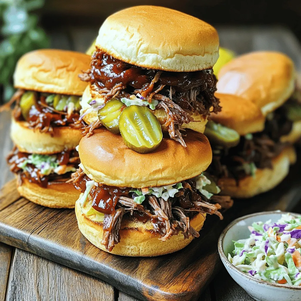 - 2 pounds beef chuck roast - 1 cup beef broth - 1 cup barbecue sauce (your choice) - 1 medium onion, sliced - 4 garlic cloves, minced - 1 teaspoon smoked paprika - 1 teaspoon brown sugar - Salt and pepper to taste To make tasty BBQ beef sliders, start with a good beef chuck roast. This cut has fat and flavor that makes the meat tender. Use beef broth and your favorite barbecue sauce to add richness. Onion and garlic bring extra taste, while smoked paprika and brown sugar add depth. - Suggested types of slider buns - Coleslaw (for topping) - Pickles (optional, for garnish) Choose slider buns that are soft and sturdy. Brioche or potato buns work well. For toppings, coleslaw adds crunch and brightness. It balances the rich beef. You can also add pickles for a tangy kick. These toppings make each bite fun and flavorful. Seasoning the beef chuck roast Start by seasoning your beef chuck roast. Use salt, pepper, and smoked paprika. Rub the spices all over the meat. This step is key for adding flavor. Importance of searing the meat Next, sear the meat. Heat a skillet over medium-high heat. Place the beef in the skillet. Sear for about 3 to 4 minutes on each side. This browning adds depth and richness to your dish. Don't skip this step! Combining ingredients in the slow cooker Now, let’s move to the slow cooker. Add sliced onion, minced garlic, beef broth, and barbecue sauce. Mix in the brown sugar too. This combination creates a tasty base for your beef. Detailed cooking times and temperature settings Place the seared beef roast in the slow cooker. Cover it and cook on low for 8 hours or high for 4 hours. The meat should be tender and easy to shred when it’s done. Tips for shredding the beef Once cooked, take the beef out and place it on a cutting board. Use two forks to shred the meat. It should fall apart with little effort. Return the shredded beef back to the slow cooker and mix it with the sauce. How to assemble the sliders effectively To assemble your sliders, grab a slider bun. Add a generous scoop of BBQ beef on top. Don’t forget to add coleslaw for crunch! You can also add pickles if you like. These toppings make your sliders even better. Enjoy each bite! To make your BBQ beef sliders even better, try these tips: - Modify Your BBQ Sauce: You can use different types of barbecue sauce. Try sweet, tangy, or spicy ones. Adding a splash of apple cider vinegar or Worcestershire sauce can add extra depth. You can also mix in some honey or mustard for a unique twist. - Add Seasonings: Besides the smoked paprika, consider adding cumin or chili powder. These spices can bring a nice warmth. A dash of cayenne pepper can add heat if you like it spicy. For a sweet touch, mix in a bit of brown sugar. To make cooking easier, follow these best practices: - Slow Cooker Tips: Always preheat your slow cooker before adding ingredients. This keeps the cooking time accurate. Avoid opening the lid too often. Every time you lift the lid, you lose heat and moisture. - Make Ahead: You can prepare this dish a day in advance. Simply cook the beef and store it in the fridge overnight. Reheat it gently the next day before serving. This makes it easy to enjoy sliders at your next party or gathering. {{image_2}} You can switch the beef for other meats. Chicken or pork works great. Both add a new taste to your sliders. For chicken, use boneless thighs or breasts. They cook nicely in the slow cooker. For pork, a pork shoulder is a good choice. It shreds well and stays juicy. Next, think about sauces. You can pick different barbecue sauces. A sweet sauce adds a nice glaze. A spicy sauce gives heat and zest. A smoky sauce brings depth of flavor. Try mixing sauces too for fun flavors. You can make this recipe work for different diets. If you need gluten-free options, look for gluten-free slider buns. Many stores sell these now. You can also use lettuce wraps instead of buns. They keep everything fresh and crunchy. For low-carb diets, skip the buns. Serve the BBQ beef on a plate with coleslaw. This keeps the meal tasty while lowering carbs. You can still enjoy all the flavors without the bread. To store leftover BBQ beef, wait for it to cool. Place the beef in airtight containers. Glass containers or plastic ones with tight lids work well. Make sure to label each container with the date. This helps you keep track of how long it’s been stored. You can keep the beef in the fridge for up to four days. If you want to save it longer, consider freezing it. Frozen BBQ beef can last for up to three months. For reheating sliders, the oven is best. Preheat your oven to 350°F (175°C). Place the sliders on a baking sheet. Warm them for about 10-15 minutes. This keeps them crispy and tasty. You can also use the microwave. Just heat them on a plate for about 30-60 seconds. To keep the sliders moist, cover them with a damp paper towel. This adds steam and stops them from drying out. Enjoy your tasty BBQ beef sliders! Can I cook the beef on high instead of low? Yes, you can cook the beef on high. It will take about 4 hours. The beef will still be tender. However, low and slow makes it even better. Cooking on low for 8 hours gives deep flavors and perfect texture. How long does shredded beef last in the fridge? Shredded beef can last 3 to 4 days in the fridge. Store it in an airtight container. This way, it stays fresh and tasty for your next meal. What side dishes pair well with BBQ beef sliders? BBQ beef sliders go well with coleslaw, potato salad, or corn on the cob. You can also serve them with chips for a crunch. These sides balance the savory flavors of the beef. Can I use BBQ beef for other meals? Absolutely! Use the BBQ beef in tacos, nachos, or on rice. It’s versatile and adds great flavor to many dishes. You can even make a BBQ beef sandwich for lunch. How to avoid overcooking the meat? To avoid overcooking, check the beef after 6 hours on low. Use a meat thermometer; it should reach 195°F to 205°F. This ensures it s