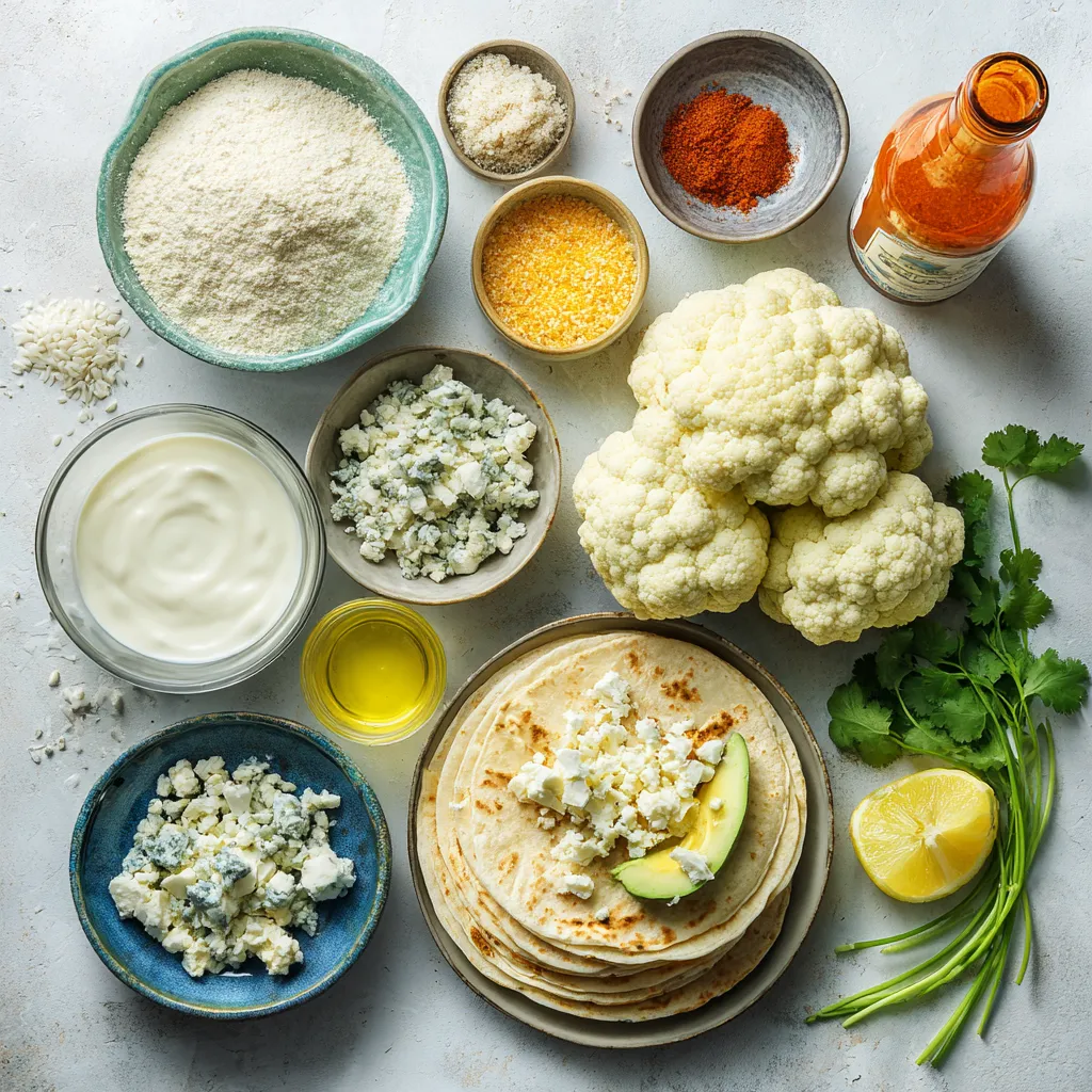 For my Buffalo Cauliflower Tacos, I start with a medium head of cauliflower. This veggie brings a nice texture and flavor. I cut it into florets, which makes them easy to handle. The batter needs flour and buttermilk, or a dairy-free choice if you prefer. The flour gives it a nice crunch when baked. I also use breadcrumbs, and Panko works best for that extra crispiness.