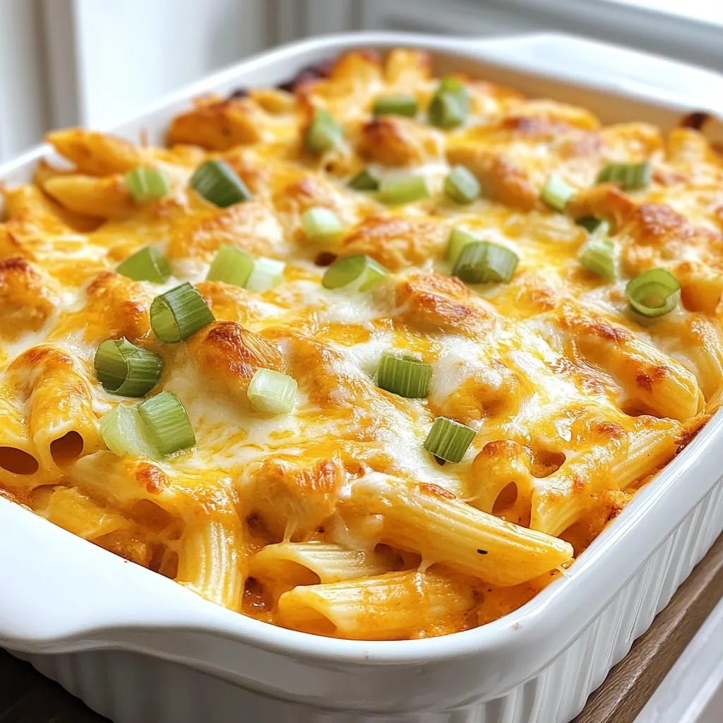 A delicious and spicy pasta bake featuring chicken and buffalo sauce, topped with melted cheese.