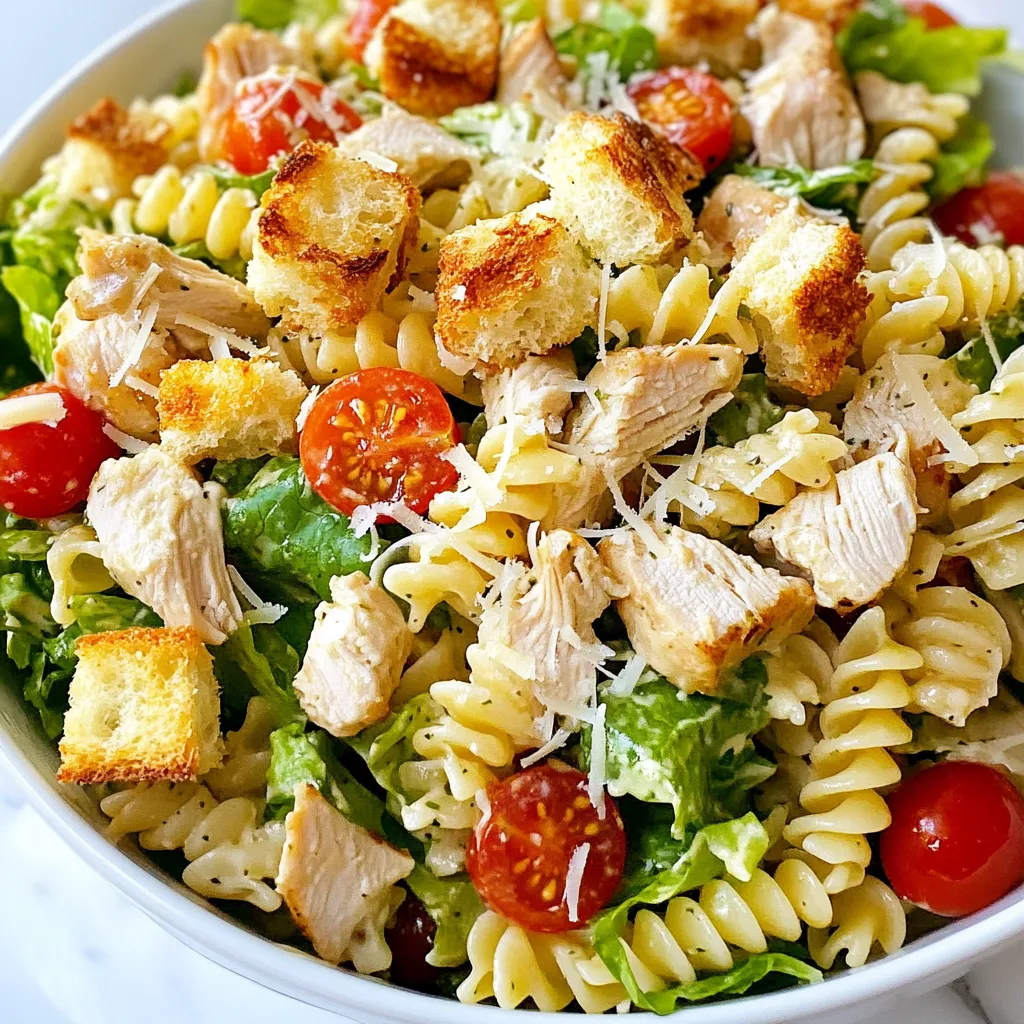 - 2 cups rotini pasta - 1 cup cooked chicken breast, diced - 1 cup Romaine lettuce, chopped The main ingredients create a hearty base for your Chicken Caesar Pasta Salad. Rotini pasta adds a fun twist and holds onto the dressing well. The cooked chicken breast gives protein, making this salad filling. Romaine lettuce adds a fresh crunch. - 1/2 cup cherry tomatoes, halved - 1/4 cup Parmesan cheese, grated - 1/4 cup Caesar dressing Cherry tomatoes bring a burst of color and sweetness. Grated Parmesan cheese adds a tangy flavor that complements the dressing. Caesar dressing ties everything together, making each bite rich and tasty. - 1/4 teaspoon garlic powder - 1/4 teaspoon black pepper - Salt to taste - Croutons for garnish Garlic powder adds depth to the salad, while black pepper gives a slight kick. Don’t forget to add salt to suit your taste. Croutons provide a crunchy topping that makes this salad even more delightful. {{ingredient_image_1}} To start, bring a large pot of water to a boil. Add a good amount of salt. This helps flavor the pasta. Once the water is boiling, add 2 cups of rotini pasta. Cook it for about 8 to 10 minutes. You want it to be al dente, which means it should be firm but not hard. After cooking, drain the pasta in a colander. Rinse it under cold water to stop the cooking. Set the pasta aside to cool completely. If you don’t have leftover chicken, you can cook chicken breasts now. A simple method is to grill or sauté them. Season the chicken with salt, black pepper, and a sprinkle of garlic powder. Cook it until the chicken is no longer pink inside. This usually takes about 6 to 8 minutes per side, depending on thickness. Once done, let the chicken cool and then dice it into small pieces. In a large mixing bowl, combine the cooled pasta, diced chicken, and 1 cup of chopped Romaine lettuce. Add in 1/2 cup of halved cherry tomatoes for a fresh touch. Drizzle 1/4 cup of Caesar dressing over the mixture. Gently toss everything together to coat all the ingredients evenly. Finally, sprinkle 1/4 cup of grated Parmesan cheese on top. Fold it in gently, making sure everything is mixed well. Taste your salad and add more salt or pepper if needed. To make a great Chicken Caesar Pasta Salad, start with the right pasta. I recommend using rotini. It holds the dressing well and offers a fun twist. Cook it until it’s al dente, which means it should have a slight bite. This keeps the pasta from getting mushy when mixed with other ingredients. For flavor balance, use fresh Romaine lettuce and ripe cherry tomatoes. The crisp lettuce adds crunch, while the tomatoes provide sweetness. When you mix everything, add the Caesar dressing slowly. This way, you can adjust to your taste. A little garlic powder and black pepper enhance the flavor, but don’t overdo it. Taste as you go! When serving, think about how it looks on the plate. Use a large bowl for family-style serving. If you want individual plates, use small bowls and layer the ingredients. This makes it look more appealing. To complement your salad, consider side dishes like garlic bread or a light soup. Both pair well and make for a complete meal. You could also serve it with a simple fruit salad for a refreshing touch. To save leftovers, store the salad in an airtight container. Keep it in the fridge, and it should last for about two days. If you have croutons, store them separately. They stay crunchy this way. When reheating, avoid the microwave for the salad. Instead, eat it cold for the best taste. If you need to warm the chicken, you can use a microwave, but be careful not to overcook it. Enjoy your tasty dish! Pro Tips Cook Pasta Al Dente: Make sure to cook the rotini pasta until it’s al dente for the perfect texture. This will prevent the pasta from becoming mushy when mixed with the other ingredients. Use Fresh Ingredients: Opt for fresh Romaine lettuce and ripe cherry tomatoes to enhance the flavor and crunch of your salad. Fresh ingredients make a noticeable difference! Chill Before Serving: Allow the salad to chill in the refrigerator for at least 30 minutes. This resting time helps the flavors to meld beautifully. Customize Your Dressing: Feel free to adjust the amount of Caesar dressing to your taste. You can also add extra seasonings or a squeeze of lemon for a brighter flavor. {{image_2}} You can change the protein in your Chicken Caesar Pasta Salad. Shrimp or tofu both work well. If you want seafood, shrimp adds a nice twist. For a plant-based option, tofu gives a great texture. You can also switch up the greens. While Romaine is classic, kale or spinach can add unique flavors. Mixing greens makes it exciting and colorful. If you want to make your own Caesar dressing, start with these simple steps. Mix 1/2 cup of mayo, 2 tablespoons of lemon juice, and 1 tablespoon of Dijon mustard. Add in garlic powder and anchovy paste for that true Caesar taste! You can also try other dressings. Ranch or Italian dressings can be delicious, too. They add their own flair to the salad. For extra flavor, consider adding crispy bacon bits or sliced olives. These toppings give a nice crunch and salty taste. You can also add seasonal ingredients. Try diced bell peppers in summer or roasted squash in fall. These add freshness and variety to the salad. Each serving of Chicken Caesar Pasta Salad has about 400 calories. This includes: - Protein: 30g - Carbohydrates: 45g - Fat: 10g This salad provides a good balance of protein from chicken, carbs from pasta, and healthy fats from the dressing. It’s filling and tasty! You can make this dish even lighter. Here are some tips: - Use whole wheat pasta to add fiber and cut calories. - Swap Caesar dressing for a yogurt-based version to reduce fat. - Add more veggies like bell peppers or cucumbers for extra nutrients. These small changes keep the flavor while making your salad healthier. This recipe has some common allergens: - Chicken: For those with poultry allergies. - Dairy: From t