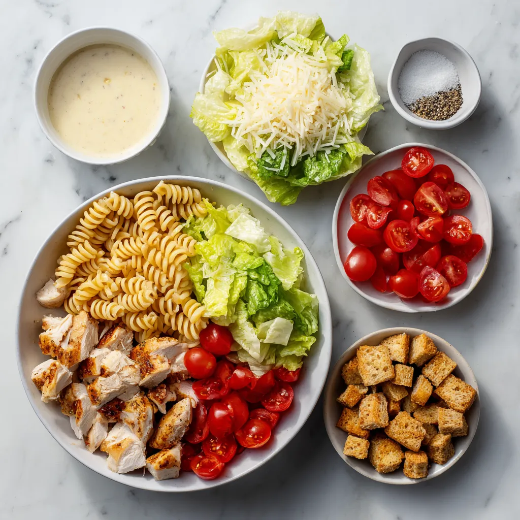 The main ingredients create a hearty base for your Chicken Caesar Pasta Salad. Rotini pasta adds a fun twist and holds onto the dressing well. The cooked chicken breast gives protein, making this salad filling. Romaine lettuce adds a fresh crunch.