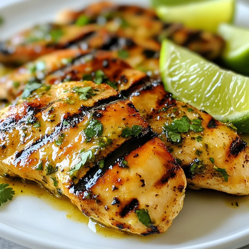 - 4 boneless, skinless chicken breasts - 1/4 cup fresh lime juice (about 2 limes) - 2 tablespoons olive oil - 2 tablespoons honey The main stars of this dish are the chicken breasts. They absorb the zesty flavors from the marinade. Fresh lime juice adds brightness, while honey gives a nice sweetness. Olive oil keeps the chicken moist as it cooks. - 2 cloves garlic, minced - 1 tablespoon chili powder - 1 teaspoon cumin - 1/2 teaspoon paprika - 1/2 teaspoon salt - 1/4 teaspoon black pepper These spices make the chicken pop with flavor. The chili powder brings heat, while cumin adds warmth. Paprika gives a lovely color. Salt and pepper round out the taste, enhancing the other flavors. - Fresh cilantro, chopped - Lime wedges Garnishing with cilantro adds a fresh touch. Lime wedges give a burst of citrus when squeezed over the chicken. These optional garnishes elevate your dish and make it visually appealing. {{ingredient_image_1}} Start by whisking together the marinade ingredients. In a bowl, mix the fresh lime juice, olive oil, honey, and minced garlic. Then, add the chili powder, cumin, paprika, salt, black pepper, and lime zest. To achieve the right consistency, ensure all ingredients blend well. The mixture should be smooth and a bit thick, so it sticks to the chicken. If it's too thin, add a touch more honey or olive oil. For the best flavor, marinate the chicken for at least 30 minutes. However, if you can, let it sit for up to 2 hours. This longer time helps the flavors soak in better. To ensure even flavor absorption, place the chicken in a resealable plastic bag or a shallow dish. Pour the marinade over the chicken and turn it to coat well. Seal the bag or cover the dish tightly. This helps the chicken absorb all the tasty flavors. Preheat your grill to medium-high heat. A hot grill gives the chicken nice grill marks and a good sear. Grill the chicken for about 6-7 minutes on each side. Check the doneness by using a meat thermometer. The internal temperature should reach 165°F (75°C). You want the chicken to be nicely charred and cooked through. After grilling, remove the chicken and let it rest for 5 minutes. This helps keep the juices in. Slice it up and enjoy! To get perfect grill marks, start with a clean grill. Preheat it to medium-high heat. Place the chicken at a 45-degree angle to the grates. This angle helps form those nice marks. Flip the chicken only once. Keep it on the grill for 6-7 minutes per side to avoid sticking. Common mistakes include not preheating the grill and overcrowding it. Both can lead to uneven cooking. Always leave space between each chicken piece. This allows for better airflow and cooking. To add extra spice, try a pinch of cayenne pepper or crushed red pepper flakes. Both boost the heat without changing the flavor too much. You can also mix in some jalapeño for a fresh kick. For different herbs, consider using fresh oregano or thyme. Both herbs offer unique flavors and pair well with lime. You can also try adding some fresh mint for a refreshing twist. If you don’t have a grill, you can cook the chicken in the oven. Preheat your oven to 400°F (200°C). Place the marinated chicken on a baking sheet and bake for 20-25 minutes. For stovetop cooking, use a cast-iron skillet. Heat the skillet over medium heat and add a bit of oil. Cook the chicken for about 6-7 minutes on each side. To keep the chicken juicy, let it rest for a few minutes after cooking. This allows the juices to settle. This step is key, no matter the cooking method you choose. Pro Tips Marinate Longer for Flavor: For the best flavor, marinate the chicken for at least 2 hours, or even overnight if possible. This allows the spices and citrus to deeply penetrate the meat. Let Your Grill Get Hot: Ensure your grill is preheated to medium-high heat before adding the chicken. This helps achieve a nice sear and prevents the chicken from sticking. Use a Meat Thermometer: To ensure your chicken is perfectly cooked, use a meat thermometer to check that the internal temperature reaches 165°F (75°C). Rest Before Slicing: Allow the grilled chicken to rest for about 5 minutes before slicing. This helps the juices redistribute, resulting in a juicier bite. {{image_2}} You can change the spice level of your chili lime grilled chicken. If you want it mild, use less chili powder. If you like more heat, add more chili powder or some diced jalapeños. You can also add grated ginger for a fresh, zesty kick. Lime zest adds brightness and enhances that citrus flavor. You don’t have to stick to just lime juice for the marinade. Try using orange juice for a sweeter touch. Soy sauce can add a nice umami flavor if you want something deeper. If you prefer a vegan option, swap the chicken for tofu or tempeh. These alternatives will soak up the marinade well and give you a tasty dish. For sides, think about fresh salads or grilled veggies. Corn on the cob pairs well with this dish, too. You can also serve it with a creamy avocado dip or salsa for added flavor. When plating, slice the chicken and arrange it on a colorful plate. Add cilantro and lime wedges for a bright finish. This makes your meal look as good as it tastes! You can store grilled chicken in the fridge for up to four days. Place it in an airtight container to keep it fresh. This helps lock in moisture and flavor. Make sure to let it cool down before sealing it. This quick cooling step prevents condensation, which can make the chicken soggy. To freeze grilled chicken, first let it cool completely. Then, wrap each piece tightly in plastic wrap or foil. Place the wrapped chicken in a freezer bag and remove as much air as possible. Label the bag with the date. Frozen grilled chicken can last for up to three months. For the best results, thaw chicken in the fridge overnight before cooking. This keeps it juicy and flavorful. When it’s time to reheat your chicken, use the oven for the best results. Preheat the oven to 350°F (175°C). Place the chi
