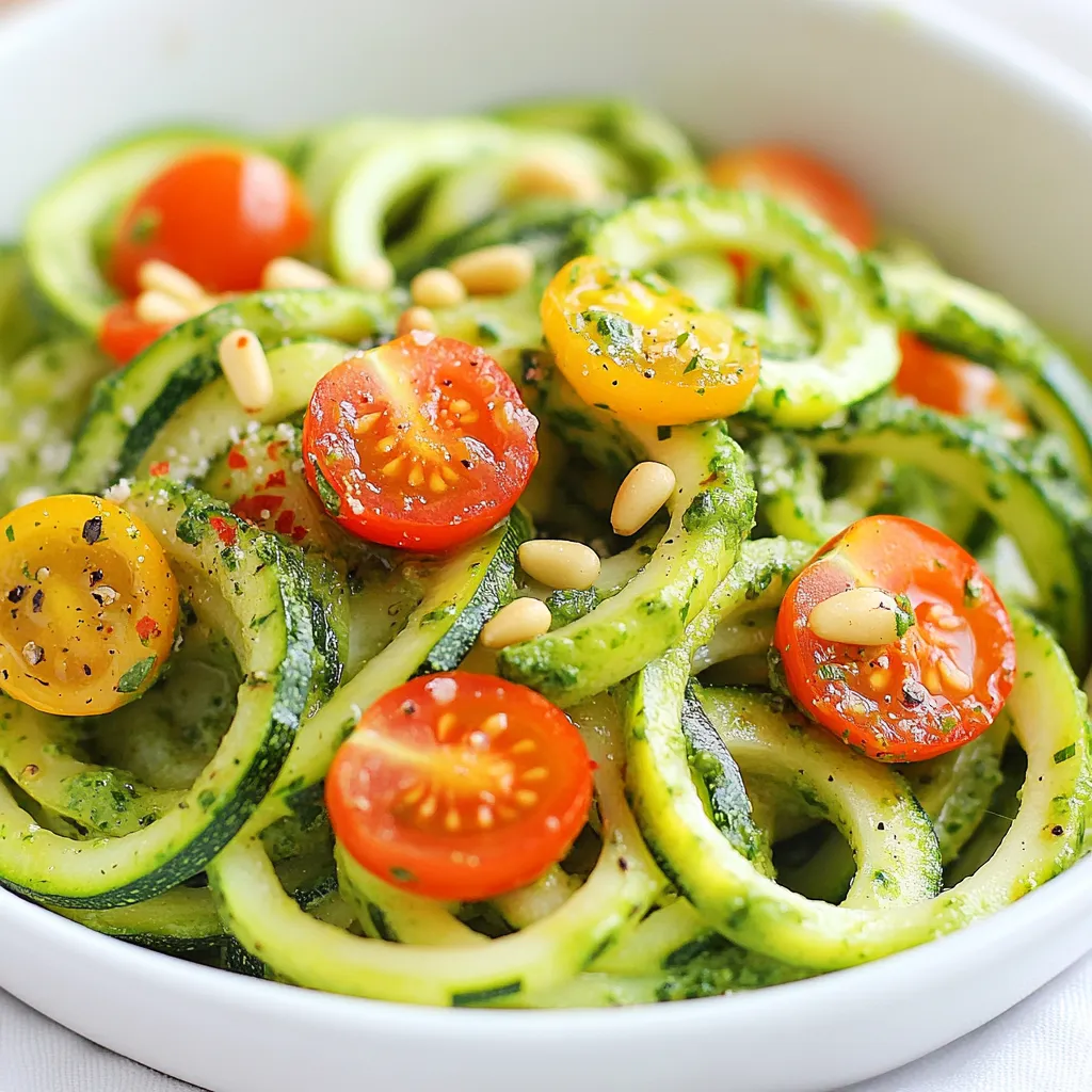 A fresh and healthy dish featuring zucchini noodles tossed in a vibrant cilantro pesto.