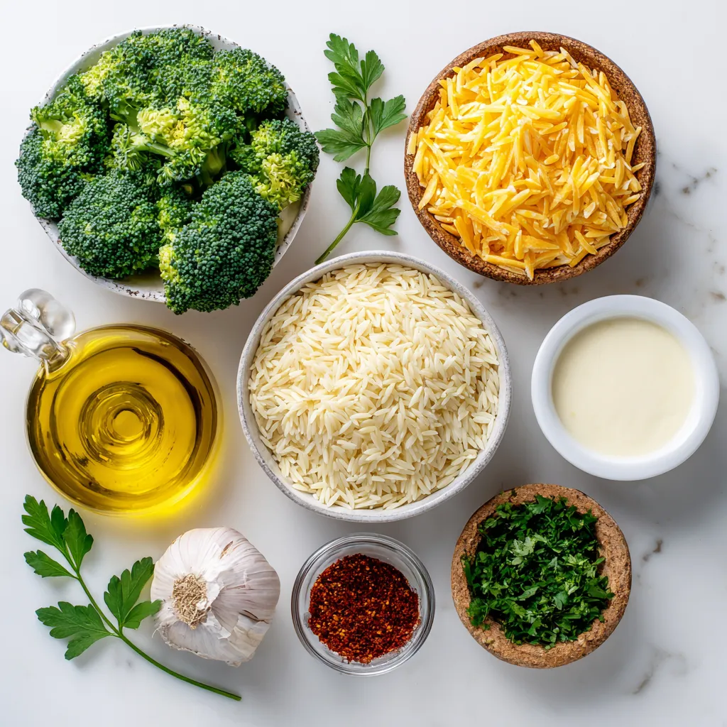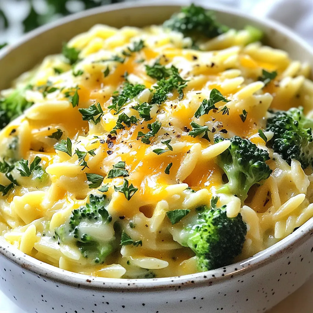 A delicious and creamy orzo pasta dish with broccoli and cheddar cheese.