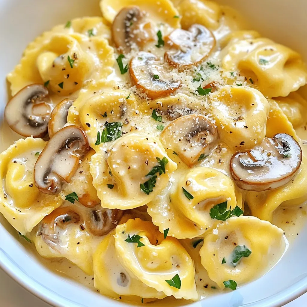 A rich and creamy pasta dish featuring cheese tortellini, sautéed mushrooms, and garlic in a luscious cream sauce.