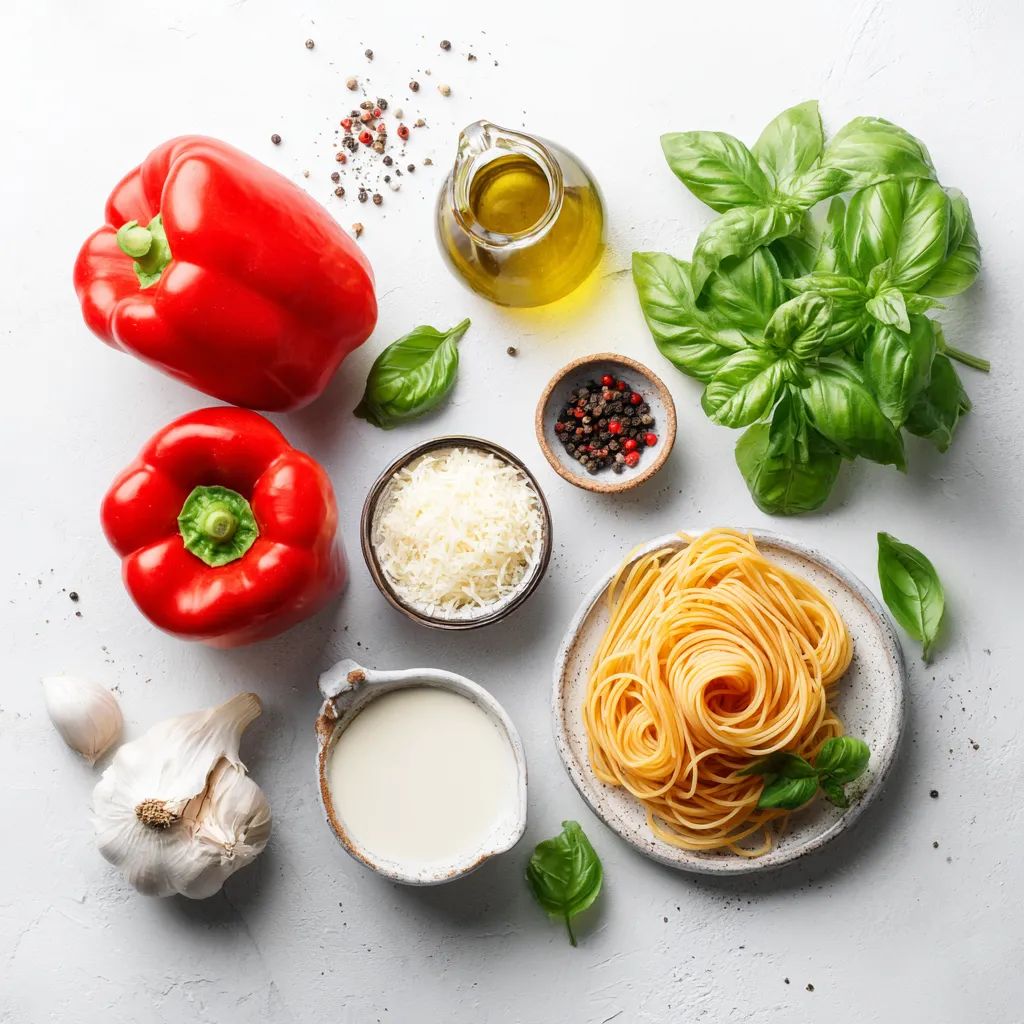 For this creamy roasted red pepper pasta, you can use fettuccine or penne. Both types hold sauce well. The red bell peppers bring sweetness and color. Heavy cream makes the dish rich and smooth.