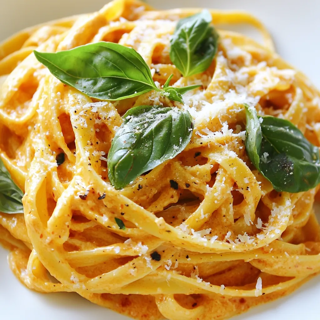 A delicious pasta dish made with creamy roasted red peppers, garlic, and Parmesan cheese.