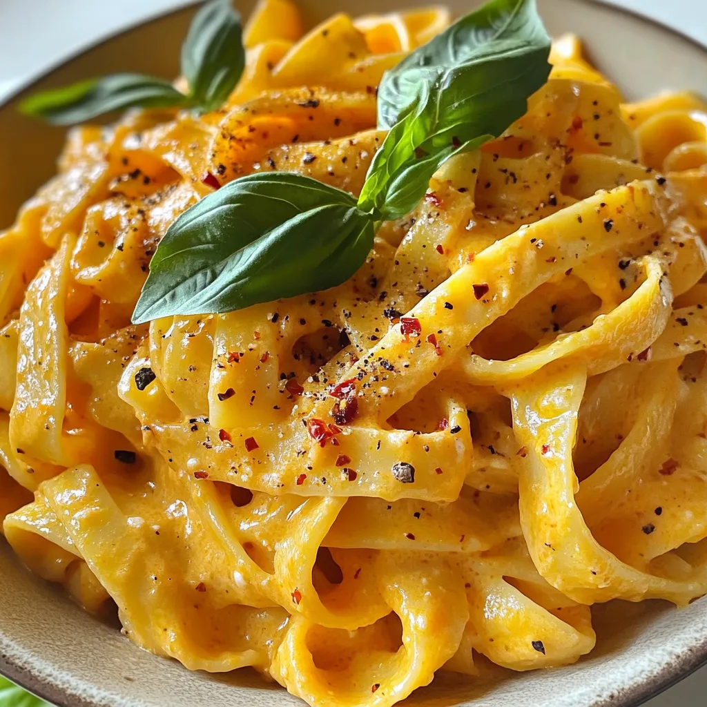 A delicious pasta dish featuring a creamy sauce made from roasted red peppers, perfect for a comforting meal.