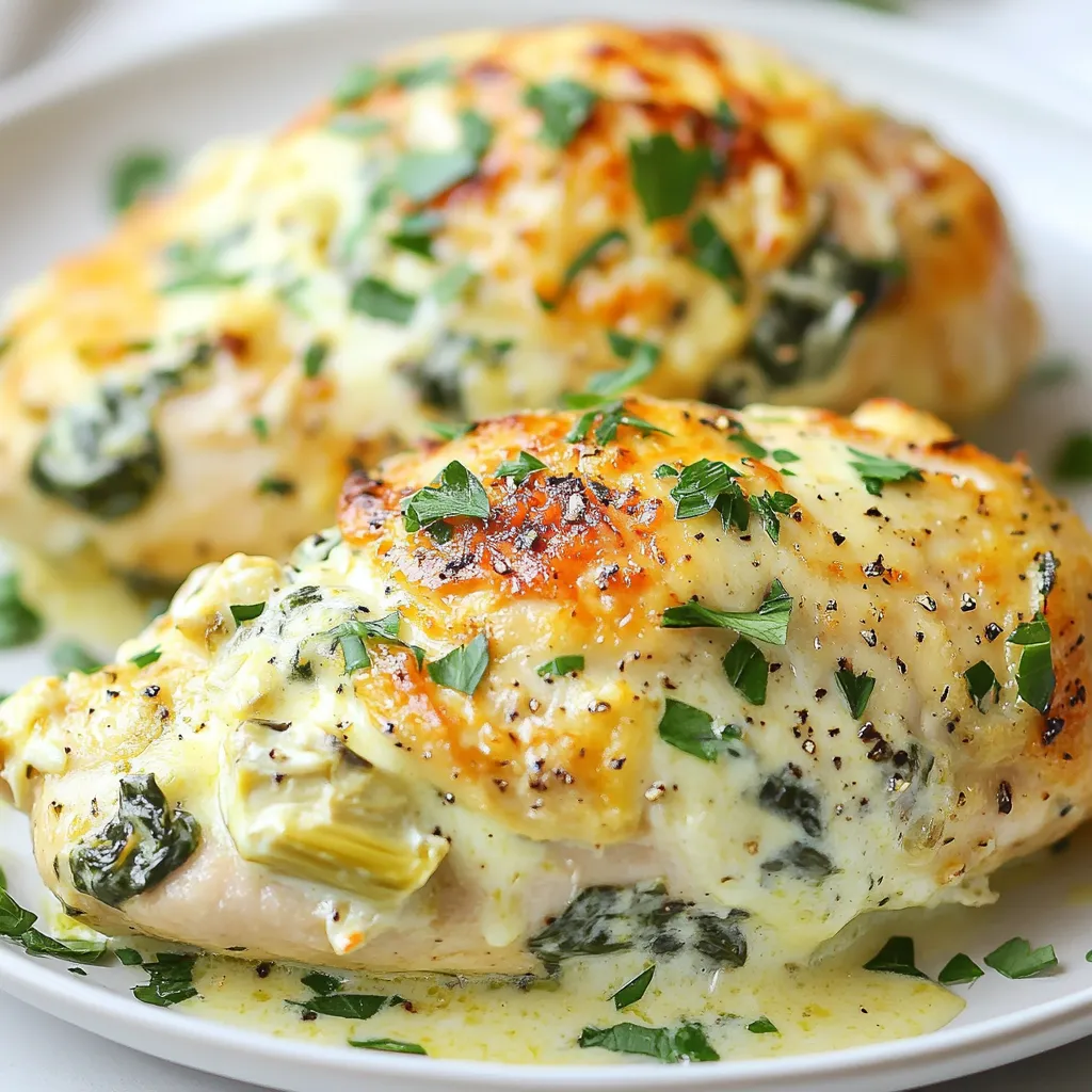 A delicious and creamy chicken dish featuring spinach and artichokes.