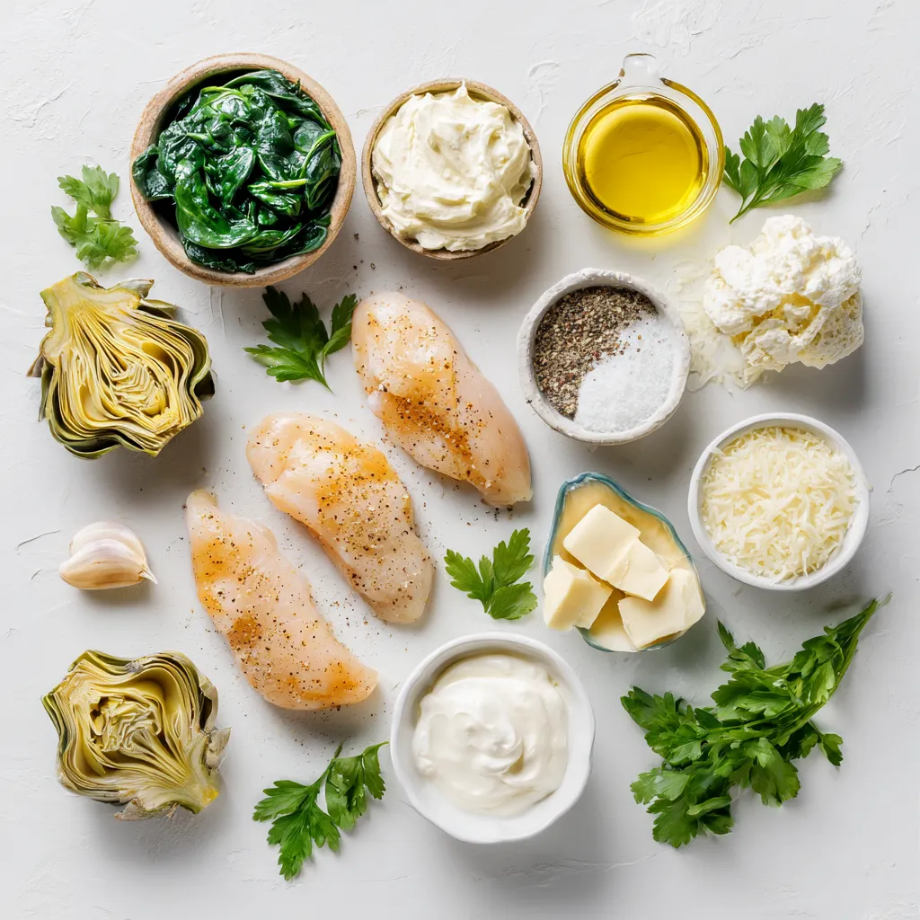 To make creamy spinach artichoke chicken, gather these simple ingredients. You need boneless, skinless chicken breasts for a tender base. Fresh spinach adds color and nutrition. Artichoke hearts give a delightful flavor and texture.