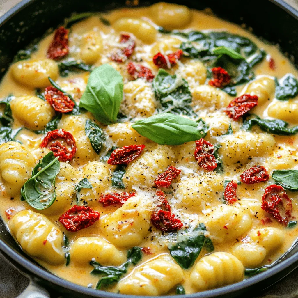 To make creamy sun-dried tomato gnocchi, gather these ingredients: - 1 package (16 oz) gnocchi - 1 cup sun-dried tomatoes in oil, drained and chopped - 2 cloves garlic, minced - 1 cup heavy cream - 1 cup vegetable broth - 1 cup fresh spinach - 1 cup grated Parmesan cheese - 2 tablespoons olive oil - 1 teaspoon dried basil - 1 teaspoon dried oregano - Salt and pepper to taste - Fresh basil leaves for garnish (optional) These ingredients create a rich and creamy dish that delights the senses. You can add extra ingredients for a flavor boost. Consider using: - Red pepper flakes for heat - Lemon zest for brightness - Mushrooms for earthiness - Chicken or shrimp for protein These options can enhance the dish to fit your taste. To prepare this dish, gather these essential tools: - Large pot for boiling - Large skillet for cooking - Colander for draining gnocchi - Wooden spoon for stirring - Measuring cups and spoons for accuracy Using the right tools makes cooking easier and more enjoyable. Start by boiling a large pot of salted water. Add the gnocchi to the pot. Cook them according to the package instructions. You will know they are done when they float to the top. This usually takes about 2-3 minutes. Once cooked, drain the gnocchi and set them aside. This step is key for a great texture. In a large skillet, heat two tablespoons of olive oil over medium heat. Add two minced garlic cloves and sauté for one minute. The garlic will smell amazing! Next, add one cup of chopped sun-dried tomatoes. Stir them in and let them cook for 2-3 minutes. This will warm them up and deepen their flavor. Pour in one cup of vegetable broth and bring it to a simmer. Next, add one cup of heavy cream, one teaspoon of dried basil, and one teaspoon of dried oregano. Stir well and let it simmer for about five minutes. This will help the sauce thicken. Now, gently stir in the cooked gnocchi and one cup of fresh spinach. Mix until the spinach wilts and the gnocchi is coated in sauce. Finally, add one cup of grated Parmesan cheese. Stir until it melts and combines. Season with salt and pepper to taste. Your dish is ready to serve! To get the best creamy texture, use heavy cream. It adds richness and smoothness. If you want it creamier, simmer the sauce longer. This will help it thicken nicely. Stir often to keep it smooth. The gnocchi will soak up the sauce, making each bite delicious. If you don't have heavy cream, you can use half-and-half. It works well but may not be as thick. Coconut milk is another good option for a dairy-free choice. You can also blend silken tofu with a bit of water. This creates a creamy texture without dairy. Each of these options will change the taste slightly, so choose what fits your needs best. To kick up the flavor, add crushed red pepper flakes for heat. A splash of lemon juice brightens the dish and adds freshness. You can also mix in different herbs, like thyme or parsley. Fresh herbs give a nice pop. If you want a cheesy twist, add more Parmesan or try goat cheese. These small changes make the dish even more exciting. {{image_2}} You can change up the veggies in this dish. Try adding mushrooms for a rich flavor. Bell peppers add sweetness, while zucchini gives a nice crunch. Even broccoli works well here. Just cut them small so they cook fast. Want more protein? Add cooked chicken or shrimp. They pair well with the creamy sauce. You can also try cooked sausage for a heartier meal. If you want a vegetarian option, use chickpeas or lentils. They will boost the nutrition without losing taste. If you need a gluten-free option, look for gluten-free gnocchi. Many brands make them from potatoes or rice. You can also use cauliflower gnocchi for a lighter meal. The sauce will still taste great! Just make sure to check the labels when you shop. To keep your creamy sun-dried tomato gnocchi fresh, cool it first. Once it's at room temperature, transfer it to an airtight container. Make sure to seal it well. Store in the fridge for up to three days. This way, the flavors stay locked in. When you're ready to enjoy leftovers, heat them gently. You can use a skillet over low heat. Add a splash of vegetable broth or cream to keep it moist. Stir often until it's warm. You can also microwave it in a safe dish. Cover it to avoid drying out. If you want to freeze the gnocchi, do it before you add the sauce. After cooking, let the gnocchi cool completely. Place them in a single layer on a baking sheet. Freeze for a couple of hours, then transfer to a freezer bag. This method helps keep them from sticking. You can store them for up to three months. When ready to use, cook them from frozen with your sauce for a quick meal. Yes, you can use fresh gnocchi. Fresh gnocchi cooks quickly and has a soft texture. It usually takes only 2-3 minutes to cook in boiling water. Just watch for it to float to the top. Then, follow the same steps in the recipe. You can use roasted red peppers instead. They add sweetness and depth to the dish. Another option is fresh tomatoes. Just chop them finely and cook them longer to soften. You might miss the tangy flavor, but the dish will still taste great. This dish is already vegetarian if you use vegetable broth. Just skip any meat toppings. Make sure to use vegetarian cheese if you want to keep it meat-free. Always check labels to be sure. This way, you can enjoy a creamy, delicious meal! This guide covers all you need for a creamy gnocchi dish. We discussed key ingredients, cooking steps, and tools to use. I provided tips for texture and flavor. You learned about tasty variations and how to store your leftovers. Remember, cooking is fun and experiments make it exciting. Enjoy your gnocchi journey and feel free to try your spin on the recipe!