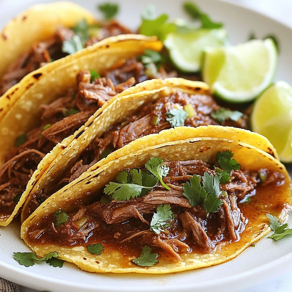 Birria tacos taste great with fresh toppings. I love using chopped cilantro for a fresh kick. Lime wedges add a nice tang when squeezed over the tacos. You can also serve them with a small bowl of broth for dipping. This adds so much flavor and makes each bite special. Enjoy your delicious creation!