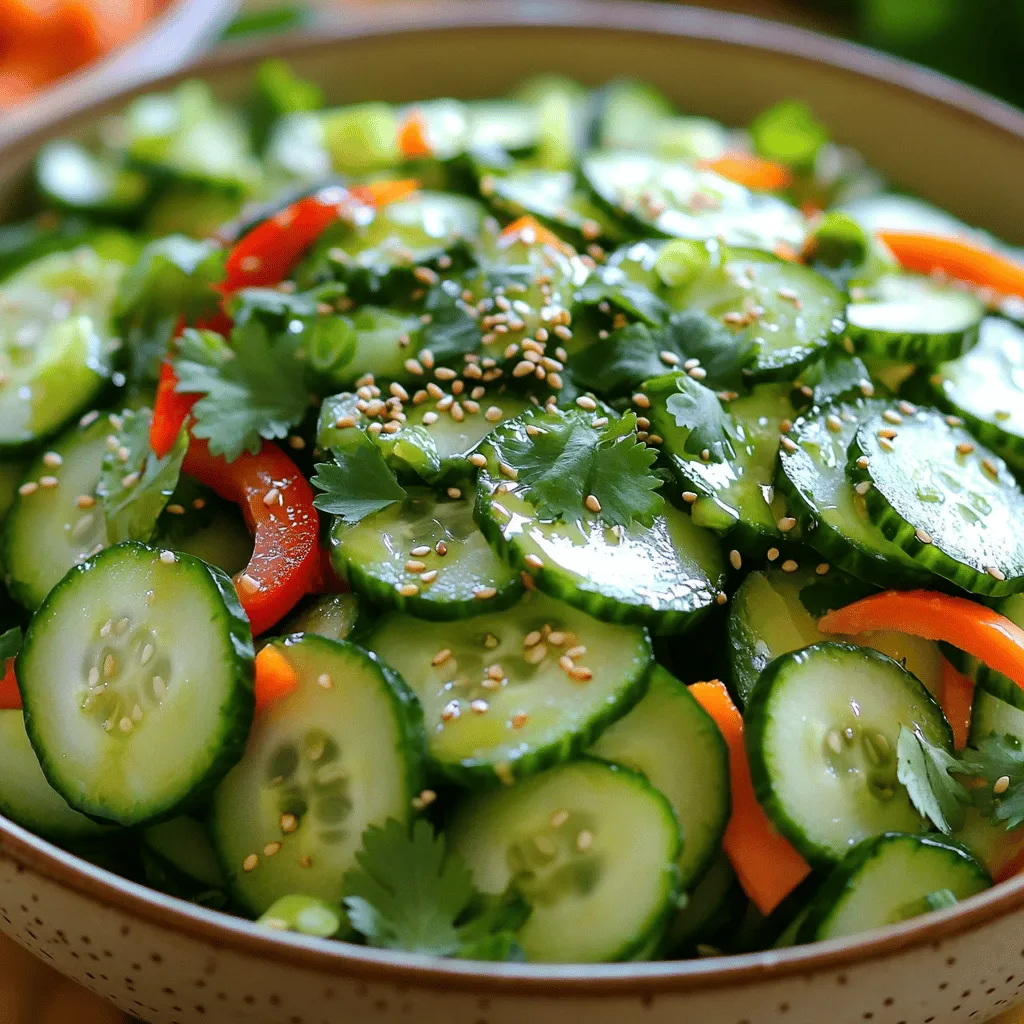 These ingredients create a bright and refreshing dish. The cucumbers and carrots give a crisp texture, while the bell pepper adds color. The dressing blends sweet and savory flavors together.