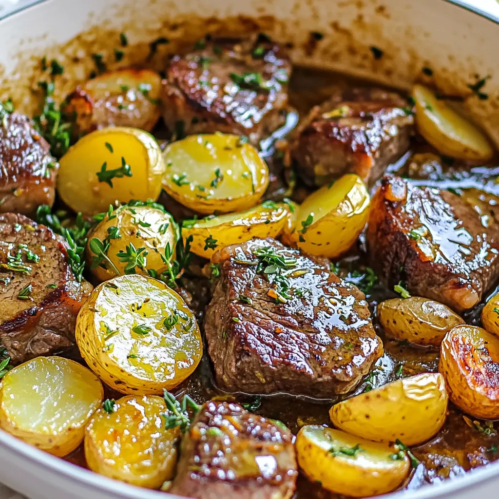 A delicious one-pan meal featuring tender sirloin steak and golden baby potatoes, all coated in a rich garlic butter sauce.