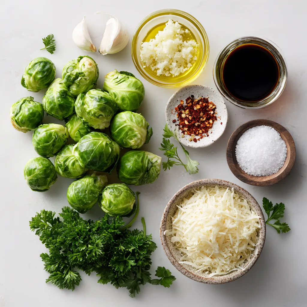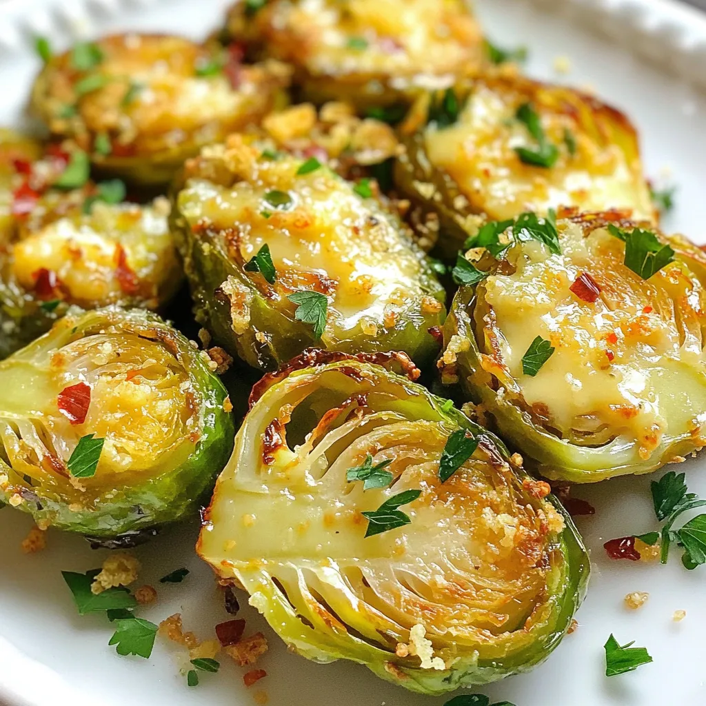 - 1 pound Brussels sprouts - 3 tablespoons olive oil - 4 cloves garlic - 1/2 cup grated Parmesan cheese - 1 teaspoon salt - 1/2 teaspoon black pepper - 1/2 teaspoon red pepper flakes - 2 tablespoons balsamic vinegar - Fresh parsley for garnish To make Garlic Parmesan Brussels sprouts, you need a few key ingredients. Start with one pound of fresh Brussels sprouts. Look for sprouts that are firm and bright green. Next, gather three tablespoons of olive oil. This oil adds richness and helps with roasting. You will also need four cloves of garlic. Minced garlic gives a strong flavor that pairs well with the sprouts. For the cheese lover in you, grab half a cup of grated Parmesan cheese. This cheese melts beautifully and adds a salty touch. Season your dish with one teaspoon of salt and half a teaspoon of black pepper. These basic seasonings enhance the natural taste of the sprouts. If you want a bit of heat, include half a teaspoon of red pepper flakes. For a tangy finish, consider adding two tablespoons of balsamic vinegar. Finally, fresh parsley is perfect for garnish. It adds a pop of color and freshness. These ingredients come together to create a dish that is both flavorful and easy to make. Enjoy the cooking process and the delicious result! {{ingredient_image_1}} First, you need to trim and halve the Brussels sprouts. Cut off the stem end and slice each sprout in half. This step helps them cook evenly. Next, preheat your oven to 425°F (220°C). A hot oven is key for a crispy finish. In a large mixing bowl, combine the halved Brussels sprouts with olive oil, minced garlic, salt, black pepper, and red pepper flakes if you want some heat. Toss everything together until the Brussels sprouts are evenly coated. This mix adds great flavor. Now, transfer the Brussels sprouts to a baking sheet. Make sure they are in a single layer with the cut side down. This helps them caramelize better. Roast them in the preheated oven for 20 minutes. After that, take the baking sheet out and sprinkle the grated Parmesan cheese over the Brussels sprouts. This cheese melts and gets nice and golden. Return the sheet to the oven and roast for another 10 minutes. Check to see if the sprouts are tender and the cheese is bubbly. Enjoy the tasty aroma! To get that nice caramel color, place the Brussels sprouts cut-side down on the baking sheet. This helps them brown evenly. Roasting at 425°F (220°C) creates a hot environment. It helps the sprouts cook through while getting crispy. For a tangy twist, consider adding balsamic vinegar. Drizzle it over the sprouts just before serving. You can also try extra seasonings. A pinch of garlic powder or lemon zest can add depth. Serve the Brussels sprouts warm on a bright platter. Sprinkle more Parmesan and fresh parsley on top. This adds a pop of color and makes the dish inviting. Consider using a nice bowl to showcase them. It makes the meal feel special. Pro Tips Choose Fresh Brussels Sprouts: Look for firm, bright green Brussels sprouts with no yellow leaves for the best flavor and texture. Use High-Quality Olive Oil: A good quality extra virgin olive oil enhances the overall taste and provides a rich flavor to the dish. Don’t Overcrowd the Pan: Make sure the Brussels sprouts are in a single layer on the baking sheet to ensure even roasting and caramelization. Experiment with Cheese: Try different types of cheese, like Pecorino Romano or cheddar, for a unique twist on the classic recipe. {{image_2}} You can switch up the cheese in this dish. Try using asiago or pecorino for a different taste. If you want a creamy texture, feta works well too. For those who prefer a vegan option, there are great substitutes. Look for nut-based cheeses or vegan Parmesan. These options melt well and still provide great flavor. To make these Brussels sprouts pop, think about adding herbs and spices. A sprinkle of thyme or rosemary can uplift the dish. You could also add a hint of lemon zest for brightness. Want some crunch? Toss in some chopped nuts like walnuts or almonds. They add texture and flavor to your sprouts. Using an air fryer can give you crispy Brussels sprouts in less time. Set your air fryer to 400°F and cook for about 15 minutes. Shake the basket halfway through for even cooking. If you prefer stovetop cooking, sauté the Brussels sprouts in a pan with olive oil. Cook them over medium heat until they are tender and golden, about 10 minutes. Both methods offer tasty results! To store leftovers, let the sprouts cool. Place them in an airtight container. They will stay fresh in the fridge for up to four days. Use a glass or plastic container with a tight seal. This helps keep the flavor and texture intact. For the best taste, reheat in the oven. Preheat it to 350°F (175°C). Spread the sprouts on a baking sheet. Heat for about 10 minutes, or until warm. If you want to re-crisp them, set the oven to broil for 2 minutes. Watch closely to avoid burning. To freeze, let the Brussels sprouts cool completely. Place them in a freezer-safe bag or container. Remove as much air as possible to prevent freezer burn. They can last for up to three months in the freezer. When ready to cook, thaw them in the fridge overnight. For quick cooking, you can toss them straight into the oven. Just add a few extra minutes to the cooking time. Yes, you can use frozen Brussels sprouts. However, they may be softer and have less flavor. Fresh sprouts are best for crispness and taste. If you use frozen, roast them longer to help them get tender. These Brussels sprouts pair well with many dishes. Try them with roasted chicken or grilled steak. They also go great with pasta or as a side for fish. Adding these to a holiday meal adds a nice touch. Brussels sprouts are done when they are tender and slightly browned. You can test them with a fork. If they pierce easily, they are ready. Look for a golden color on the cheese for extra flavor. This blog post shows you how to make Garlic Parmesan Brussels sprouts