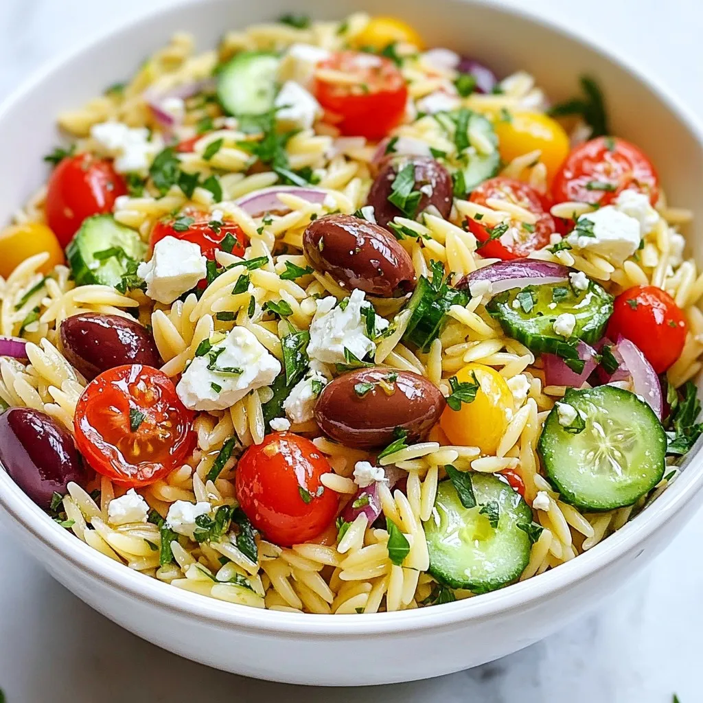 You can easily make Greek Orzo Salad vegetarian. Just skip the feta cheese, or use a plant-based one. For a vegan version, use a dairy-free feta. You can also add more veggies, like bell peppers or spinach, to boost flavor and nutrition.