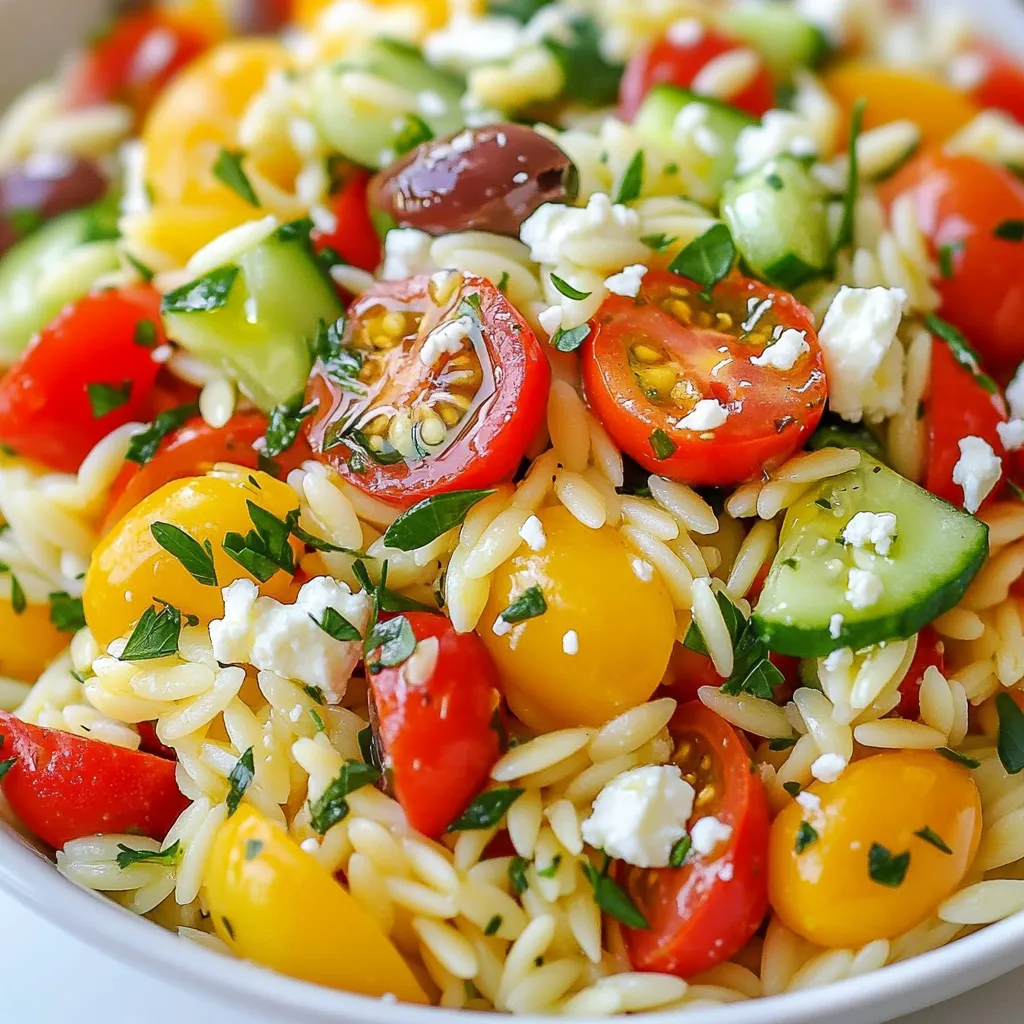 A refreshing and flavorful salad featuring orzo pasta, fresh vegetables, and feta cheese, perfect for a light meal or side dish.