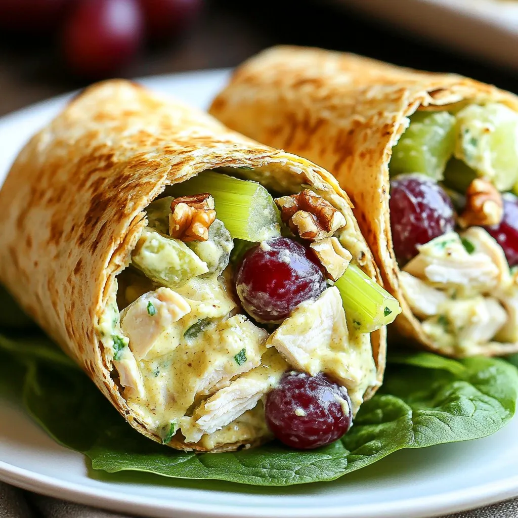 - 2 cups cooked chicken breast, shredded - 1 cup Greek yogurt - 1 tablespoon Dijon mustard - 1 tablespoon honey - 1/2 cup celery, finely chopped - 1/2 cup red grapes, halved - 1/4 cup chopped walnuts (or pecans) - 2 green onions, sliced - 1 teaspoon dried dill - Salt and pepper to taste - 4 large whole wheat or spinach tortillas - Fresh spinach or lettuce leaves for wrapping I love using fresh, simple ingredients for Greek yogurt chicken salad wraps. The main ingredients shine through, giving you a tasty meal. Shredded chicken is the base. I prefer cooked chicken breast for a lean option. Greek yogurt adds creaminess while keeping it light. Dijon mustard brings tang, and honey adds a hint of sweetness. For extra crunch and flavor, I add celery, halved grapes, and walnuts. Celery gives a nice bite, while grapes add sweetness. Walnuts, or pecans if you prefer, add a nutty crunch. Green onions add a fresh taste, and dill brings an herby note. Don't forget salt and pepper to make all the flavors pop. Whole wheat or spinach tortillas are perfect for wrapping everything up. They add fiber and color. Fresh spinach or lettuce leaves provide a crisp layer. This balance makes the dish not just healthy but also satisfying and fun to eat. Enjoy crafting this easy meal! {{ingredient_image_1}} - Combine 2 cups of shredded chicken, 1 cup of Greek yogurt, 1 tablespoon of Dijon mustard, and 1 tablespoon of honey in a large bowl. - Mix well until the chicken is fully coated. This makes the salad creamy and tasty. - Add 1/2 cup of finely chopped celery, 1/2 cup of halved red grapes, 1/4 cup of chopped walnuts, 2 sliced green onions, and 1 teaspoon of dried dill to the chicken mix. - Stir everything together until all the ingredients blend well. This gives your salad great texture and flavor. - Lay out 4 large whole wheat or spinach tortillas flat on a clean surface. - Place a handful of fresh spinach or lettuce leaves in the center of each tortilla. - Spoon the chicken salad mixture over the greens, spreading it evenly. - Fold the sides of the tortilla inward and roll it up tightly from the bottom. - Slice each wrap in half diagonally and serve right away, or wrap them in parchment paper for a meal on the go. You can make this dish your own. Try adding different nuts or fruits. Walnuts add crunch, but pecans work great too. You can also swap in apples or raisins for a sweet twist. For more taste, use flavored Greek yogurt. Honey or vanilla yogurt can enhance the flavor. These wraps shine when paired with fresh side salads or healthy snacks. Carrot sticks or cucumber slices are simple options. You can also serve them with a light dressing or dip. A yogurt dip or vinaigrette adds a nice touch. You can prep the chicken salad the day before. This makes your meal quick and easy. Just store it in the fridge. Wrap the meal tightly in parchment paper for freshness. This way, it stays delicious until you're ready to eat! Pro Tips Use Leftover Chicken: For a quicker preparation, use leftover rotisserie chicken or any cooked chicken you have on hand. Customize Your Nuts: Feel free to substitute walnuts with pecans or even sunflower seeds for a different crunch and flavor. Make It Ahead: You can prepare the chicken salad a day in advance and store it in the refrigerator for a hassle-free meal. Experiment with Herbs: Fresh herbs like parsley or cilantro can elevate the flavor of the chicken salad if you prefer a more vibrant taste. {{image_2}} You can switch out the chicken for turkey or even canned chicken. Both options are tasty and save time. If you want a vegetarian twist, try using chickpeas instead. They add great protein and a nice texture. Just mash them slightly and mix them in with your Greek yogurt. If you want to cut carbs, try lettuce wraps. They are crunchy and fresh, making them a great choice. For those with dietary needs, use gluten-free tortillas. They work just as well and keep your meal healthy. To make your chicken salad even better, add fresh herbs like parsley or cilantro. These herbs brighten up the flavors. You can also include spices like paprika or cumin. They add warmth and depth to your dish, making each bite more exciting. You can keep leftover chicken salad in airtight containers. This helps keep it fresh longer. Store any wraps in parchment paper in the fridge. This method allows for easy transport and keeps them from getting soggy. Can the chicken salad be frozen? Yes, you can freeze the chicken salad. To do so, place it in freezer-safe bags. Remove all air before sealing. This helps prevent freezer burn. For wraps, freeze them before you add greens or sauce. Wrap each one tightly in plastic wrap. Place them in a freezer bag for best results. How long does chicken salad last in the fridge? It stays fresh for about 3 to 4 days. Make sure to check for any changes in smell or texture before eating. For guidelines on freshness, follow these tips: - Store chicken salad right after preparing it. - Always keep it at a cool temperature. - If you see any signs of spoilage, throw it away. Yes, you can make the salad ahead. Mix the chicken salad and store it in the fridge. This keeps it fresh. You can fill the wraps just before serving. This saves time when you are busy. This recipe makes four servings. Each wrap has a good size for a meal. You can adjust the portion size based on your needs. If you want more, just double the recipe. Yes, this recipe is great for meal prep. The chicken salad stays fresh in the fridge. You can pack the wraps for lunch or snacks. Just keep the salad and tortillas separate until you're ready to eat. This keeps your wrap from getting soggy. This blog covers how to make Greek Yogurt Chicken Salad Wraps. We discussed key ingredients like cooked chicken, Greek yogurt, and crunchy veggies. I walked you through simple steps for mixing and wrapping. You learned tips for customizing flavors and storing leftovers. In closing, this recipe is easy and flexible. You can make it 