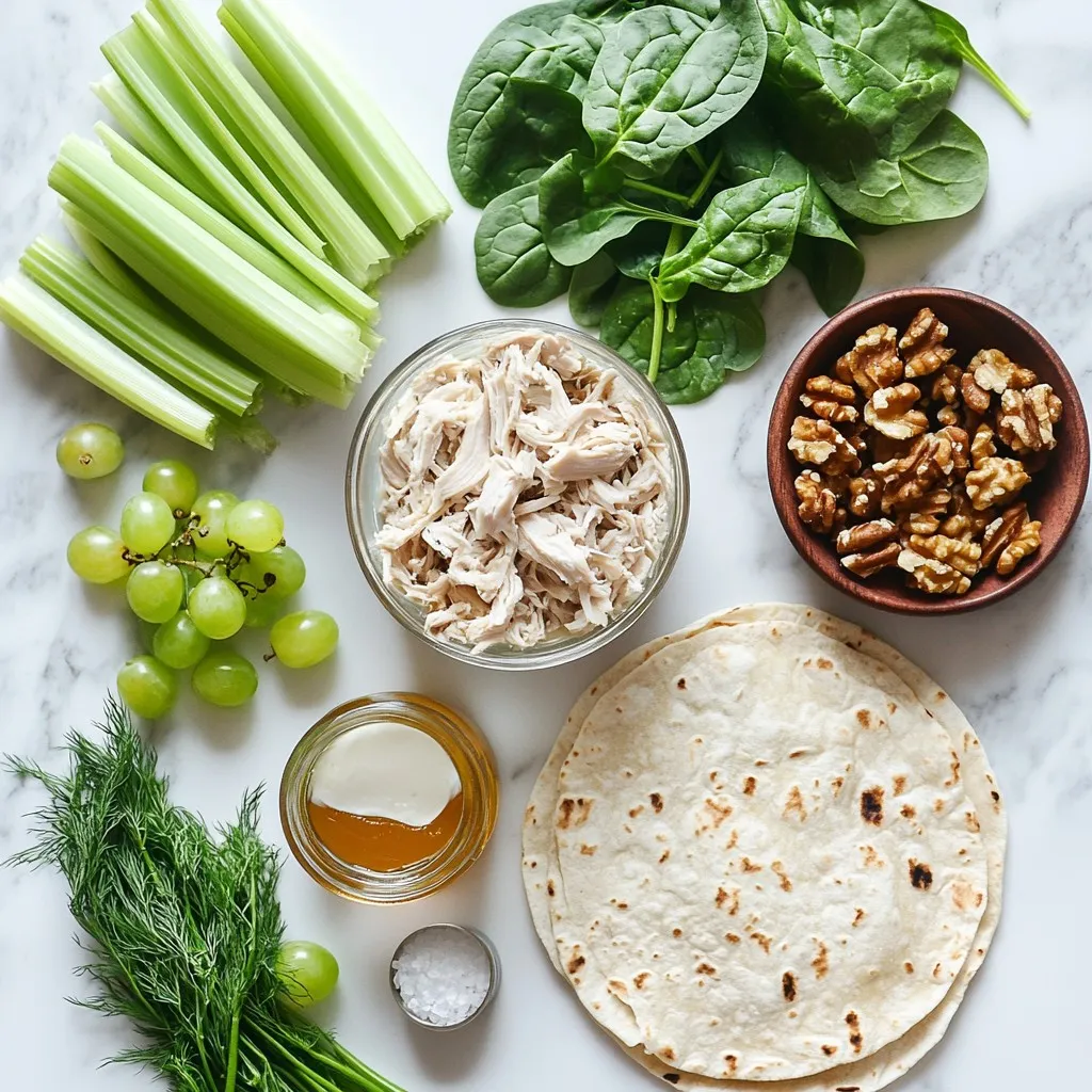 I love using fresh, simple ingredients for Greek yogurt chicken salad wraps. The main ingredients shine through, giving you a tasty meal. Shredded chicken is the base. I prefer cooked chicken breast for a lean option. Greek yogurt adds creaminess while keeping it light. Dijon mustard brings tang, and honey adds a hint of sweetness.
