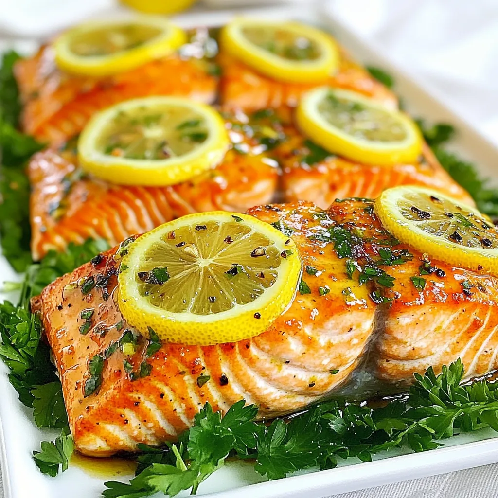 After baking, take the salmon out of the oven. Let it rest for a couple of minutes. This helps keep it juicy. When you’re ready to serve, garnish with lemon slices and chopped parsley. For a nice touch, serve the salmon on a platter lined with fresh greens. Drizzle any extra sauce over the top for a glossy look. Enjoy!