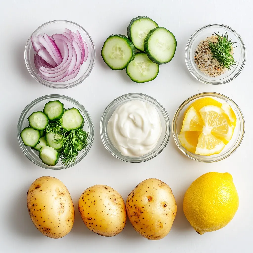 To make a zesty lemon dill potato salad, you need the right ingredients. Baby potatoes are great for this recipe. They are small and creamy. Fresh dill adds a bright flavor. Greek yogurt and mayonnaise make the dressing rich and creamy. Lemon juice and zest bring freshness and tang. Dijon mustard adds a nice kick. Garlic powder gives it depth. Don’t forget to season with salt and pepper. Finally, red onion and cucumber add crunch and color.