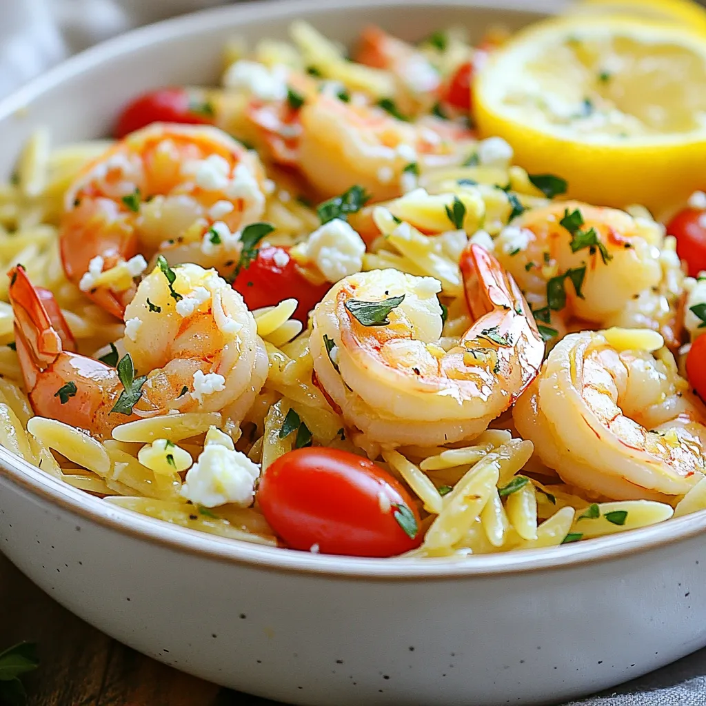 When making Lemon Garlic Shrimp Orzo, you need fresh and flavorful ingredients. Here’s what you will need: - 1 cup orzo pasta - 1 pound medium shrimp, peeled and deveined - 3 tablespoons olive oil - 4 cloves garlic, minced - 1 lemon (juice and zest) - 1 teaspoon red pepper flakes - 1/2 cup cherry tomatoes, halved - 1/4 cup fresh parsley, chopped - Salt and pepper to taste - 1/4 cup feta cheese, crumbled (optional) Each ingredient plays a key role in the dish. The orzo is the base, providing a comforting texture. The shrimp adds protein and flavor, while the garlic and lemon create a bright taste. Use fresh parsley for color and freshness. If you like cheese, feta gives a creamy touch. Feel free to mix things up. Try adding more veggies or different herbs. The beauty of this dish is how you can customize it to your taste. Each ingredient adds to the overall deliciousness of your meal. {{ingredient_image_1}} To cook orzo pasta correctly, start with a large pot of salted boiling water. Add 1 cup of orzo and cook it for about 8-10 minutes. Follow the package instructions for exact times. You want the orzo to be al dente. This means it should be tender but still have a slight bite. To achieve this texture, test the orzo a minute or two before the time is up. Drain the orzo and save 1/2 cup of the pasta water for later. Now, let’s sauté the shrimp. Heat 3 tablespoons of olive oil in a large skillet over medium heat. Once the oil is hot, add 4 cloves of minced garlic and 1 teaspoon of red pepper flakes. Sauté for about 1 minute until the garlic smells great but is not brown. Next, add 1 pound of medium shrimp to the skillet. Season them with salt and pepper. Cook the shrimp for 2-3 minutes on each side. They are ready when they turn pink and opaque. Be careful not to overcook them, as they can become tough. Now, it's time to combine everything. In the skillet with the shrimp, add the cooked orzo, 1/2 cup halved cherry tomatoes, the juice and zest of 1 lemon, and the reserved pasta water. Toss everything together gently. This helps the flavors mix well and ensures every bite is tasty. Make sure everything is heated through before serving. Finally, stir in 1/4 cup of chopped fresh parsley for a fresh touch. If you want, sprinkle 1/4 cup of crumbled feta cheese over the top before serving. Enjoy your Lemon Garlic Shrimp Orzo! To boost flavor, use fresh garlic and lemon. I love using minced garlic for its strong taste. Sauté garlic in olive oil until it smells great. Add lemon juice and zest for a bright kick. You can also adjust spice levels with red pepper flakes. Start with a teaspoon, then add more if you like heat. Serving is key for a great meal. Use a large, shallow bowl for the orzo. This gives it space to shine. Add extra parsley for a fresh touch. Lemon wedges on the side make it pop. They also let guests add more zing! Sauté shrimp with care. Ensure your skillet is hot, but not too hot. Cook shrimp for 2-3 minutes on each side. They should turn pink and opaque. When you drain orzo, save some pasta water. This water adds flavor and helps mix everything well. It’s a secret trick for creamy dishes! Pro Tips Use Fresh Shrimp: For the best flavor and texture, opt for fresh shrimp if available. Frozen shrimp can be used; just ensure they are fully thawed before cooking. Adjust the Heat: The amount of red pepper flakes can be tailored to your heat preference. Start with less and add more if you like a spicier dish. Reserve Pasta Water: Always save some pasta water before draining. It helps to create a creamy sauce when combined with the other ingredients. Garnish Wisely: Fresh herbs and a sprinkle of feta cheese not only enhance the flavor but also add a beautiful touch to your dish presentation. {{image_2}} You can switch up the shrimp for chicken or veggies. Chicken works great, adding a nice flavor. Just cut it into bite-sized pieces. Cook it until it's no longer pink. For veggies, try bell peppers, zucchini, or asparagus. These add color and crunch. You can also change the pasta. While orzo is perfect, you can use penne, fusilli, or even rice. Each type brings a new feel to the dish. Just follow the cooking times on the package for best results. Consider adding other herbs to boost flavor. Basil and thyme are great choices. They add depth and freshness. Simply chop them finely and stir them in at the end. Spices can also change the taste. A pinch of smoked paprika will add warmth. Cumin can bring earthiness. Experiment with what you love. Just start with a little, taste, and adjust as needed. This way, you can create your unique version of lemon garlic shrimp orzo! To keep your Lemon Garlic Shrimp Orzo fresh, let it cool to room temperature. Store leftovers in an airtight container. Place the container in the fridge. This dish stays good for up to three days. Make sure to check for any off smells or changes in texture before eating. You can freeze Lemon Garlic Shrimp Orzo for up to three months. To freeze, use a freezer-safe container or bag. Remove as much air as possible to avoid freezer burn. When ready to eat, thaw it in the fridge overnight. Reheat it gently in a skillet over low heat. Add a splash of water or broth to keep it moist. This way, your dish stays tasty and flavorful. You can keep leftovers of Lemon Garlic Shrimp Orzo in the fridge for about 3 days. Make sure to store it in an airtight container. This keeps it fresh and tasty. If you notice any odd smell or change in color, it’s best to toss it out. Yes, you can make Lemon Garlic Shrimp Orzo ahead of time! To meal prep, cook the orzo and shrimp as directed. Store them separately in the fridge. When you’re ready to eat, just reheat them together in a skillet. This way, the shrimp won’t get overcooked. To make a full meal, you can pair this dish with a light salad or steamed veggies. A crisp green salad with lemon vinaigrette works well. For drinks, try a chilled white wine or sparkling water with lemon. These
