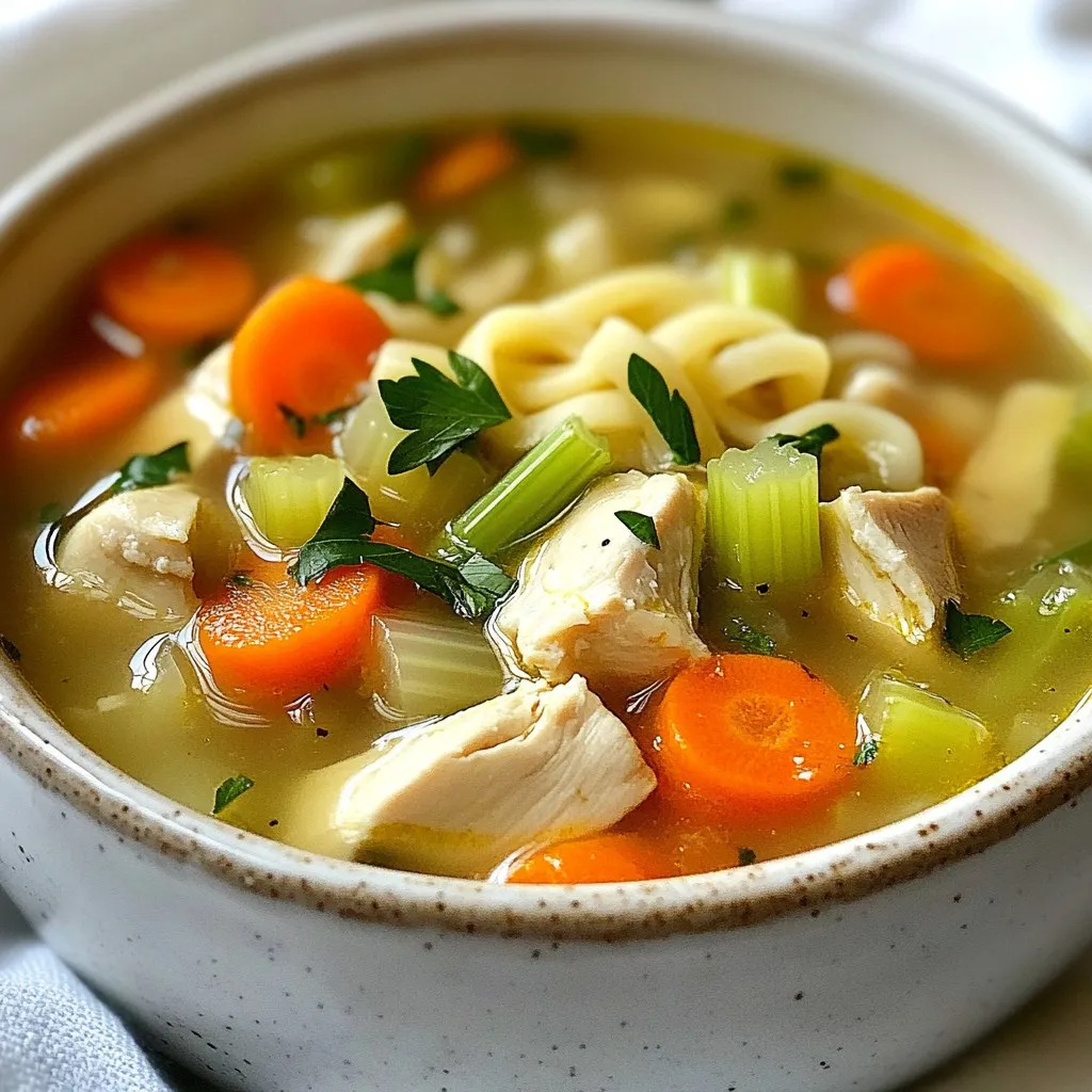 - 1 lb boneless, skinless chicken thighs or breasts - 8 cups low-sodium chicken broth - 1 cup carrot, diced - 1 cup celery, diced - 1 medium onion, finely chopped - 4 cloves garlic, minced - 1 teaspoon fresh thyme or ½ teaspoon dried thyme - 1 teaspoon fresh dill or ½ teaspoon dried dill - 1 cup egg noodles or whole grain noodles - 1 tablespoon olive oil - Salt and pepper to taste - 2 tablespoons lemon juice - Fresh parsley for garnish Gathering the right ingredients is key to making Light Chicken Penicillin Soup. First, you'll need your chicken. I like to use chicken thighs for their rich flavor. You can also use chicken breasts for a leaner option. Next, grab some low-sodium chicken broth. This helps keep the soup healthy and tasty. For veggies, diced carrots, celery, and onion add nice texture and flavor. Now, let’s add some flavor enhancers. I always use fresh garlic, thyme, and dill. They really bring out the taste of the soup. If you want to make it heartier, consider adding egg noodles or whole grain noodles. A splash of lemon juice adds a fresh zing. Don't forget salt and pepper for that essential seasoning. Finally, a sprinkle of fresh parsley makes your soup look great and adds a pop of color. With these ingredients, you’re set to create a warm, nourishing meal. {{ingredient_image_1}} 1. In a large pot, heat the olive oil over medium heat. 2. Add the chopped onion, carrots, and celery. Sauté for about five minutes. 3. Cook until the vegetables start to soften. 4. Add the minced garlic and cook for one more minute until fragrant. 1. Add the diced chicken to the pot. 2. Season with salt, pepper, thyme, and dill. 3. Brown the chicken on all sides for about seven to eight minutes. 1. Pour in the chicken broth and bring the mixture to a boil. 2. Reduce heat to a simmer and add the egg noodles. 3. Cook according to package instructions, about eight to ten minutes, until noodles are tender. 4. Stir in the lemon juice and taste. Adjust seasoning with salt and pepper if needed. - Use low-sodium broth for a healthier option. This helps keep the soup light. - Adjust cooking time based on noodle type. Whole grain noodles may need a bit longer. - Substitute chicken with tofu for a vegetarian version. Tofu absorbs flavor well. - Use gluten-free noodles for a gluten-free option. This keeps everyone happy at the table. - Garnish with fresh parsley for an appealing look. The green adds a nice touch. - Serve with crusty bread for a complete meal. Bread soaks up the tasty broth nicely. Pro Tips Use Fresh Herbs: Fresh thyme and dill will enhance the flavor profile of your soup, making it more aromatic and delicious. Adjust the Noodles: For a healthier version, consider using whole grain noodles or adding more vegetables instead of noodles. Enhance the Broth: For a richer taste, you can simmer the broth with leftover chicken bones or add a splash of white wine. Serve with a Twist: Add a sprinkle of red pepper flakes for a little heat or a dollop of yogurt for creaminess when serving. {{image_2}} You can enhance your soup by adding extra veggies. Spinach or kale brings more nutrients. These greens add color and health benefits. They are easy to add; just toss them in at the end. You can also use peas for a sweet touch. They add a pop of flavor and texture. Simply stir them in during the last few minutes of cooking. This small change makes a big difference. If you want a change, try different proteins. Using turkey makes a leaner option. It's just as tasty and still very filling. Cut the turkey into small pieces and cook it like chicken. For a fun twist, consider shrimp. This seafood brings a unique flavor. Just add the shrimp during the last few minutes of cooking. They cook quickly and stay tender. If you like heat, spice things up! Add red pepper flakes for a kick. Start with a small amount, then adjust to your taste. This adds warmth without overwhelming the dish. Incorporate jalapeños for a bolder flavor. You can slice them and add them early in the cooking. They bring a nice bite, perfect for spice lovers. Store your Light Chicken Penicillin Soup in an airtight container. It will last for up to 3 days in the fridge. While this soup is best enjoyed fresh, you can easily reheat it when needed. Just make sure to heat it gently to keep the flavors intact. If you want to save some for later, freeze the soup in individual portions. This makes it easy to grab a quick meal on busy days. When you're ready to eat, thaw it overnight in the fridge. This helps keep the texture nice when you reheat it. To reheat your soup, warm it gently on the stove or in the microwave. If you notice it’s a bit thick, add a splash of chicken broth. This helps avoid dryness and keeps it nice and soupy. Enjoy your comforting bowl of soup anytime! Chicken penicillin soup is a warm, comforting dish that many people love. The traditional version is rich and creamy, often made with heavy cream and lots of fat. My light version swaps out some of those rich ingredients for healthier choices. I use low-sodium chicken broth and lean chicken thighs or breasts. This keeps the soup tasty without the heaviness. Fresh herbs like thyme and dill add great flavor, and the lemon juice gives it a bright touch. You still get all the cozy feels, but with fewer calories. Yes, you can make this soup in advance! It actually tastes better after sitting for a bit. To prepare ahead, follow these steps: - Cook the soup as directed but stop before adding the egg noodles. - Let the soup cool before storing it in the fridge. - When ready to eat, reheat the soup and add the noodles. Cook until the noodles are tender. This way, you keep the noodles from getting mushy. It’s a smart way to meal prep! You can easily modify this soup to fit many diets: - Low-carb: Skip the egg noodles or use zucchini noodles instead. This keeps it low in carbs while still being filling. - Vegetarian: Replace the chicken with tofu or chickpeas for protein. Use vegeta