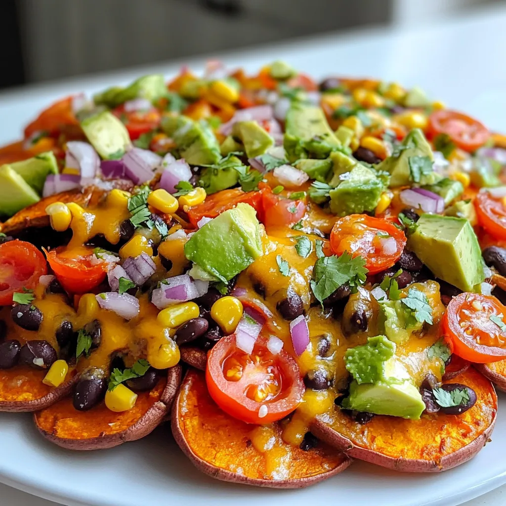 These ingredients create a colorful and tasty base for your nachos. Sweet potatoes add fiber and nutrients, while black beans provide protein. Corn gives a nice crunch, and cheese binds it all together.