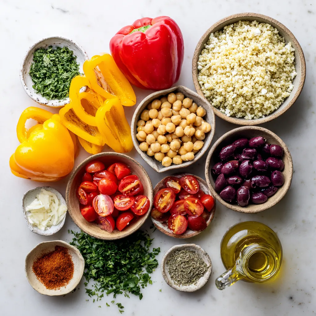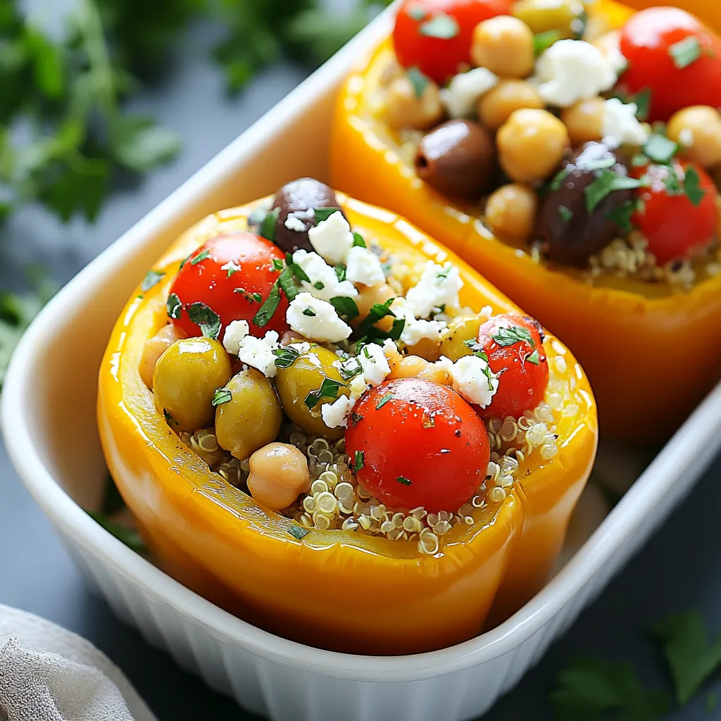 Delicious bell peppers stuffed with quinoa, chickpeas, and Mediterranean flavors.