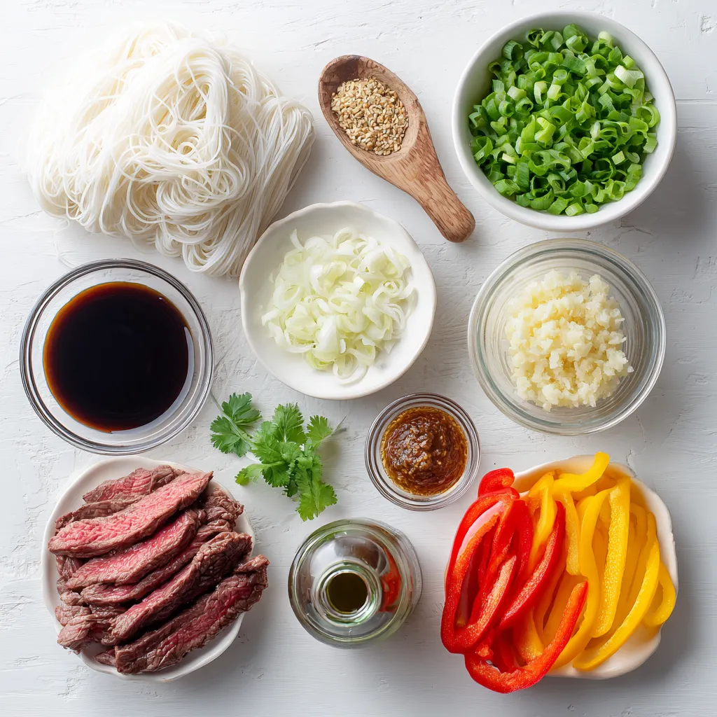 To make Mongolian beef noodles, gather these key items. The rice noodles serve as the base. Flank steak brings rich flavor. The seasonings and sauces create a bold taste. You’ll need garlic, ginger, soy sauce, brown sugar, hoisin sauce, and sesame oil.