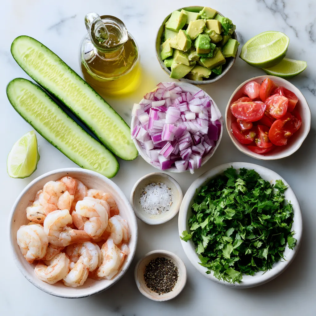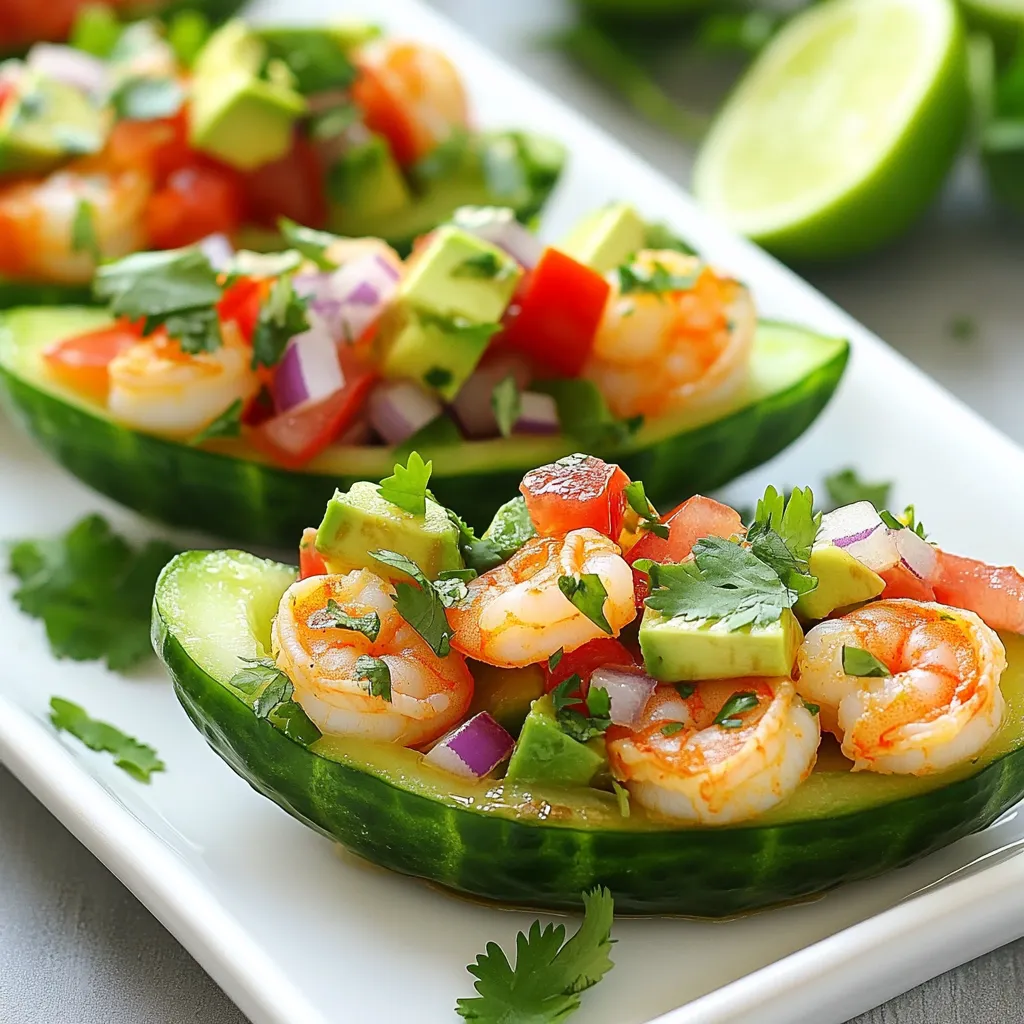 - 2 large cucumbers - 1 cup cooked shrimp, peeled and deveined - 1 ripe avocado, diced - 1 small red onion, finely chopped - 1 ripe tomato, diced - 2 tablespoons fresh lime juice - 1 tablespoon olive oil - Salt and pepper to taste - 1 teaspoon fresh cilantro, chopped (for garnish) You can add more taste to your shrimp avocado cucumber boats. Consider using: - Jalapeño for some heat - Garlic for a bold flavor - Bell peppers for crunch - Lettuce for extra texture Choosing fresh ingredients makes a big difference. Here’s how to pick the best: - Cucumbers: Look for firm cucumbers with dark green skin. Avoid soft spots. - Shrimp: Buy shrimp that is pink and smells fresh. If using frozen, thaw it safely. - Avocado: Choose avocados that yield slightly when pressed. They should not be too hard or mushy. - Onion and Tomato: Select onions with a firm texture and tomatoes that are ripe and fragrant. - Cilantro: Pick fresh cilantro with bright green leaves. Avoid yellow or wilted leaves. {{ingredient_image_1}} 1. Start by slicing your cucumbers in half lengthwise. This gives you the boat shape. 2. Use a spoon to scoop out the seeds gently. This step is key for holding the filling. 3. Place the hollowed-out cucumber halves on a platter. This makes them ready for filling. 4. In a mixing bowl, combine cooked shrimp, diced avocado, chopped red onion, and diced tomato. 5. Drizzle lime juice and olive oil over the mixture. Toss it gently to combine. 6. Season with salt and pepper. Be careful not to mash the avocado. It should stay chunky. 7. Spoon the shrimp mixture evenly into the cucumber boats. Fill them up nicely. 8. Finish by garnishing with fresh cilantro. This adds color and flavor. To make perfect cucumber boats, choose large cucumbers. They should be firm and straight. Slice them carefully to avoid breaking. Use a small spoon for scooping out seeds. A grapefruit spoon works well too. This tool has sharp edges, making it easier to scoop. Cut just enough of the center to create a cavity. You want a nice shape without breaking the skin. If you remove too much, they won’t hold the filling. Serve your shrimp avocado cucumber boats cold. They are great as an appetizer or snack. Pair them with tortilla chips for a crunchy side. You can also add a squeeze of lime on top for extra zest. Keep them chilled until serving to enjoy the fresh flavors. To keep cucumbers fresh, store them in the fridge. Wrap them in a damp paper towel. Put them in a plastic bag. This helps keep moisture in, so they stay crisp. Use them within a week for the best taste. When mixing shrimp and avocado, be gentle. Use a soft spatula to fold the ingredients. This way, the avocado stays chunky and creamy. You want the flavors to blend without mashing the avocado. Add lime juice last to keep the color bright and fresh. You can serve these boats with different dips. Try a spicy mayo or a tangy yogurt sauce. For a crunchy twist, add some chopped nuts or seeds on top. If you want a heartier meal, serve with rice or quinoa. This makes the dish more filling and satisfying. Pro Tips Choose Fresh Shrimp: Always opt for fresh or high-quality frozen shrimp for the best flavor and texture. Perfectly Ripe Avocado: Make sure your avocado is perfectly ripe for the best taste; it should yield slightly to pressure when squeezed. Chill Before Serving: For an extra refreshing dish, chill the cucumber boats in the refrigerator for about 30 minutes before serving. Customize Your Ingredients: Feel free to add other ingredients like corn or bell peppers for additional flavor and crunch. {{image_2}} You can swap shrimp for other proteins. Here are some great options: - Cooked chicken: Diced cooked chicken works well. - Crab meat: Use lump crab for a sweet taste. - Tofu: Firm tofu offers a plant-based choice. - Canned tuna: It’s easy and quick to use. These proteins keep the flavor and texture enjoyable. Simply replace shrimp in the recipe with your choice. Adding herbs and spices can change the taste. Here are some ideas: - Dill: Adds a fresh, bright flavor. - Basil: Gives a sweet and aromatic touch. - Cumin: Adds warmth and earthiness to the dish. - Chili flakes: For a bit of heat, sprinkle some in. Feel free to mix and match these flavors. It’s fun to create your own twist! If you want to make this dish vegan or gluten-free, here are some tips: - Vegan: Replace shrimp with chickpeas or lentils. They add protein and texture. - Gluten-free: This recipe is already gluten-free. Just make sure all ingredients are certified gluten-free. These substitutions keep the dish tasty while meeting your dietary needs. Enjoy the versatility of these shrimp avocado cucumber boats! To keep your shrimp avocado cucumber boats fresh, place them in an airtight container. This helps lock in flavor and prevent drying out. It is best to store them in the fridge. If you separate the shrimp mixture from the cucumbers, they will stay fresh longer. These shrimp avocado cucumber boats taste best cold. If you want to enjoy them warm, you can heat the shrimp mixture gently in a pan. Just make sure not to overcook the shrimp. After heating, let it cool a bit before adding it back to the cucumbers. The shrimp mixture can last up to two days in the fridge. The cucumbers should be eaten within a day for the best taste. If the avocado starts to brown, add a bit more lime juice. This will help keep it fresh longer. Yes, you can use frozen shrimp. Just be sure to thaw them first. You can place them in cold water for about 15 minutes. After thawing, cook them if they are not already cooked. This method makes the shrimp safe and tasty for your dish. If you have allergies, consider these swaps: - Use crab or chicken instead of shrimp. - Try a different oil like avocado oil. - Replace avocado with hummus for a creamy texture without allergens. - For a nut-free dish, skip any nuts or seeds in toppings. These swaps keep your meal delicious and safe. To reduce moisture in cucumbers, try thes