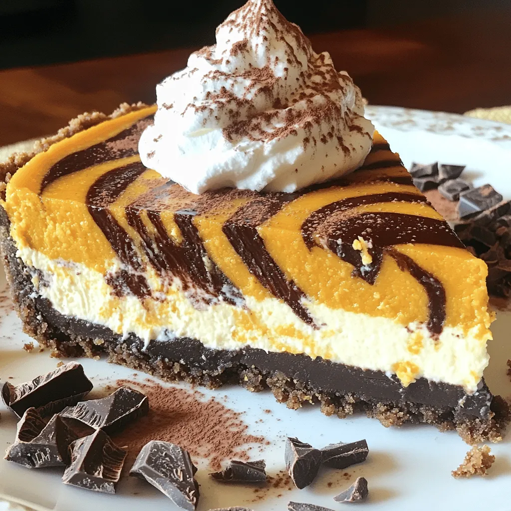 - 1 ½ cups graham cracker crumbs - ½ cup unsalted butter, melted - 3 (8 oz) packages cream cheese, softened - 1 cup granulated sugar - 1 cup pumpkin puree - 3 large eggs - 1 tablespoon vanilla extract - 1 teaspoon pumpkin pie spice - 1 cup semi-sweet chocolate chips - 2 tablespoons heavy cream The main ingredients create a rich and creamy texture. Cream cheese brings that smooth base. Pumpkin puree adds warmth and a lovely fall flavor. Eggs help bind everything together. The graham cracker crust gives it a crunchy base. The melted butter makes it stick. The semi-sweet chocolate chips add a sweet twist, while the heavy cream helps create that swirl. - Whipped cream and cinnamon - Chocolate shavings For extra flair, top your cheesecake with whipped cream. A sprinkle of cinnamon adds warmth. Chocolate shavings give a nice touch and enhance the dessert. These toppings make each slice even more delightful and beautiful. You can play with the toppings based on your preference! - Preheat the oven to 325°F (160°C). - In a bowl, combine 1 ½ cups of graham cracker crumbs and ½ cup of melted unsalted butter. Mix until it feels like wet sand. - Press this mixture firmly into the bottom of a greased 9-inch springform pan. Bake for 10 minutes. Let it cool. - In a large bowl, beat 3 packages of softened cream cheese with an electric mixer. - Gradually add 1 cup of granulated sugar. Mix until smooth. - Then, add 1 cup of pumpkin puree, 3 large eggs, 1 tablespoon of vanilla extract, and 1 teaspoon of pumpkin pie spice. Beat until fully mixed and creamy. - In a small saucepan over low heat, melt 1 cup of semi-sweet chocolate chips with 2 tablespoons of heavy cream. Stir until smooth. - Pour half of the pumpkin cheesecake mixture over the cooled crust. - Drop spoonfuls of the melted chocolate onto the pumpkin layer. Use a knife to gently swirl the chocolate into the mixture. - Pour the rest of the pumpkin mixture on top. Repeat the swirling with the remaining chocolate. - Bake for 55-60 minutes until the edges set but the center jiggles slightly. - Turn off the oven and crack the door. Let the cheesecake cool in the oven for one hour. - Once cool, refrigerate for at least 4 hours or overnight. - Before serving, run a knife around the pan's edge and remove the sides of the springform pan. How to prevent cracking To keep your cheesecake smooth, avoid overmixing the batter. Mix just until smooth. Also, avoid opening the oven door while it bakes. This helps keep the heat steady. If you see cracks forming, don't worry! A swirl of chocolate can hide them well. Cooling methods in the oven After baking, turn off the oven and crack the door. This lets the cheesecake cool slowly. A sudden temperature change can cause cracks. Let it sit for one hour in the oven. Then, chill it in the fridge for at least four hours. Overnight is even better! Presentation ideas for special occasions Slice the cheesecake neatly and serve on dessert plates. For a fun touch, add a dollop of whipped cream on each slice. You can sprinkle cinnamon on top for extra flavor. Try adding chocolate shavings to the plate for a fancy look! Pairing with beverages This cheesecake pairs well with coffee or hot cocoa. The rich flavors balance nicely with warm drinks. For a fun twist, serve it with spiced apple cider. This adds a nice fall touch to your dessert. Best springform pan Use a 9-inch springform pan for this recipe. This size makes it easy to remove the cheesecake without breaking it. Look for a pan with a sturdy base. A good seal will keep the batter from leaking. Essential mixing tools An electric mixer works best for smooth cheesecake. It saves time and gives you a creamy texture. You’ll also need a rubber spatula to scrape down the bowl. This ensures all ingredients mix well. A sharp knife helps with slicing the cheesecake cleanly. {{image_2}} You can easily make this cheesecake for different diets. For a gluten-free crust, use gluten-free graham crackers. Just crush them and mix with melted butter. Press it into the pan like you would with regular crumbs. If you want a vegan version, swap cream cheese for a plant-based alternative. Look for brands made from nuts or tofu. This will keep the creamy texture while fitting a vegan diet. To boost the flavor, add spices like nutmeg or clove. These spices add warmth and depth to the pumpkin. You can mix them right into the pumpkin layer for a tasty twist. You can also switch up the chocolate. Instead of semi-sweet chocolate chips, try dark or white chocolate. Each type brings a unique flavor to your cheesecake. Dark chocolate makes it rich, while white chocolate adds sweetness. For a fun twist, make mini cheesecake cups. Use small cups or muffin tins. This makes them easy to serve at parties. Layer them with pumpkin and chocolate for a lovely look. Another idea is to create layered dessert jars. Stack spoonfuls of the pumpkin cheesecake and melted chocolate in jars. This way, guests can enjoy a stylish treat with a perfect blend of flavors. To keep your cheesecake fresh, store it in the fridge. Use an airtight container or cover it tightly with plastic wrap. This way, it keeps its yummy taste and stays moist. The cheesecake can stay fresh for up to five days in the refrigerator. Just make sure to eat it before it gets too old! If you want to save some for later, freezing is a great option. First, let the cheesecake cool completely after baking. Then, slice it into individual pieces. Wrap each slice tightly in plastic wrap and place them in a freezer bag. This helps to keep the flavor and texture. You can freeze it for up to three months. When you're ready to enjoy a slice, take it out of the freezer. Place it in the fridge overnight to thaw. If you're in a hurry, you can let it sit at room temperature for about an hour. Then, it’s ready to serve! Making Pumpkin Chocolate Swirl Cheesecake takes about 6 hours total. Here’s how the time breaks down: - Prep Time: 20 minutes - Bake Time: 55