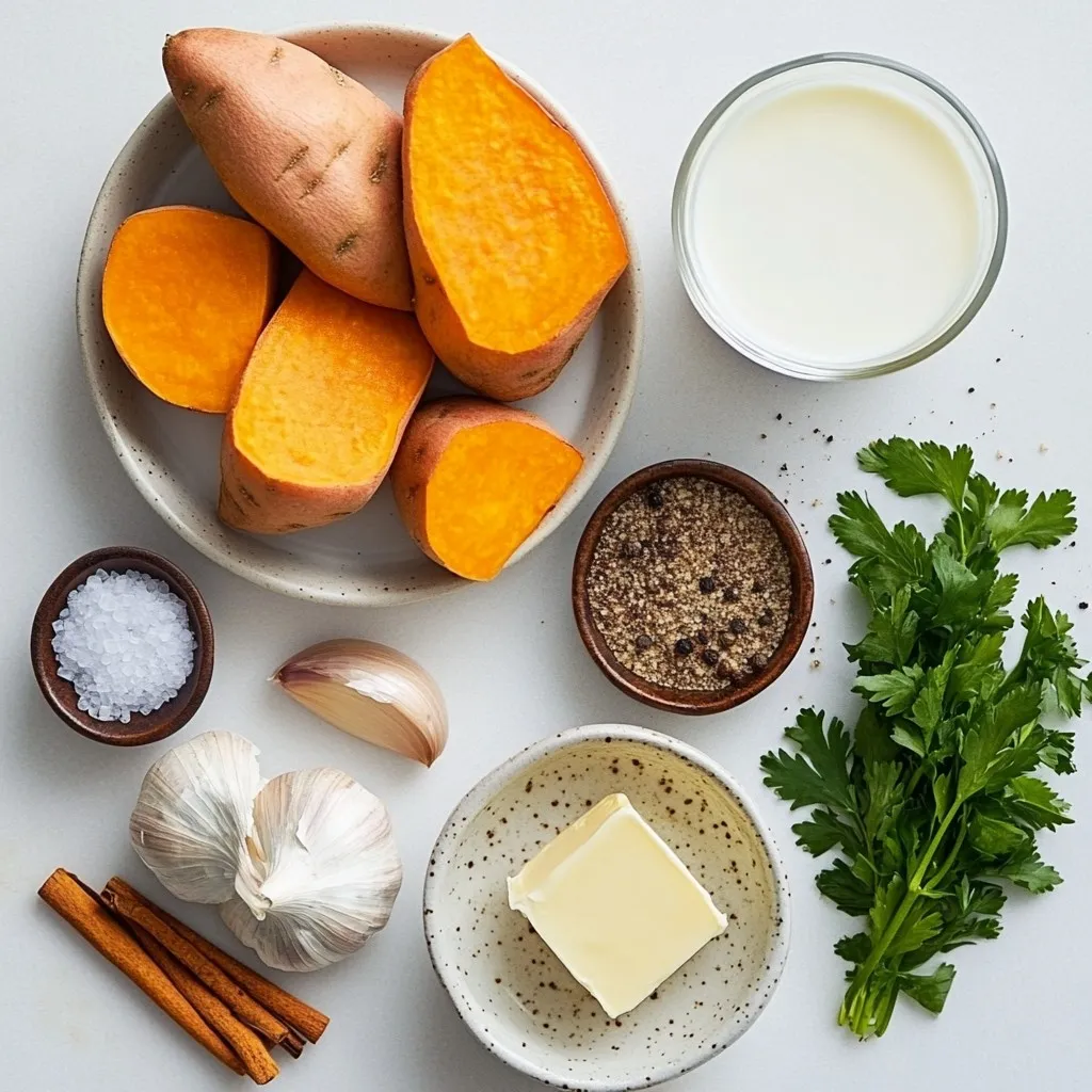 To make roasted garlic sweet potato mash, you need just a few simple items. Begin with 4 medium sweet potatoes. They should be peeled and cubed for easy cooking. Garlic is key for flavor, so grab one whole bulb. You will also need 3 tablespoons of olive oil for roasting.