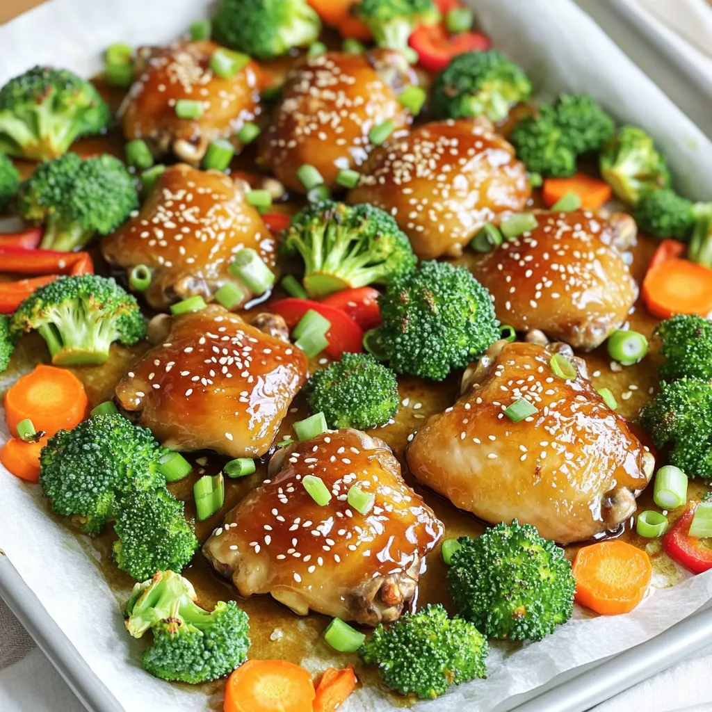 - 4 bone-in, skin-on chicken thighs - 1/4 cup honey - 1/4 cup soy sauce (low sodium) The main stars of this dish are the chicken thighs. They have rich flavor and juicy meat. The honey adds sweetness, while the soy sauce gives a savory kick. This mix makes a nice glaze that coats the chicken well. - 1 cup broccoli florets - 1 cup baby carrots - 1 red bell pepper, sliced Adding vegetables makes the dish colorful and healthy. Broccoli gives a nice crunch. Baby carrots add sweetness, and red bell pepper brings brightness. Each veggie cooks well and absorbs the honey garlic flavor. - 4 cloves garlic, minced - 1 tablespoon fresh ginger, grated - 1 tablespoon sesame seeds (for garnish) - 2 green onions, sliced (for garnish) Garlic and ginger are key for flavor. They add depth and aroma. After cooking, sprinkle sesame seeds and green onions on top. This makes the dish look great and adds a fresh taste. First, you need to preheat your oven to 425°F (220°C). This high heat helps the chicken and veggies cook quickly. Next, take a large baking sheet and line it with parchment paper. This step makes cleanup easy and keeps the food from sticking. In a mixing bowl, combine the following ingredients: - 1/4 cup honey - 1/4 cup soy sauce (low sodium recommended) - 4 cloves garlic, minced - 1 tablespoon fresh ginger, grated - 1 tablespoon olive oil - Salt and pepper to taste Whisk these together until smooth. This marinade gives the chicken a sweet and savory flavor. Now, place the chicken thighs on the prepared baking sheet. Pour half of the honey garlic marinade over the chicken. Make sure each piece is coated well. Set aside the other half of the marinade for later. Next, add 1 cup of broccoli florets, 1 cup of baby carrots, and 1 sliced red bell pepper around the chicken. Drizzle these veggies with a bit of olive oil, salt, and pepper. Toss them gently to coat. Put the baking sheet in your preheated oven. Roast everything for 25-30 minutes. The chicken should reach an internal temperature of 165°F (74°C). Check the veggies too; they should be tender. Halfway through cooking, brush the remaining honey garlic marinade over the chicken. This step boosts the flavor even more. Once cooked, take the baking sheet out of the oven. Let the chicken rest for 5 minutes. This resting time makes the chicken juicy. Finally, garnish with sesame seeds and sliced green onions before serving. This dish looks great and tastes even better! To check for doneness, use a meat thermometer. Insert it into the thickest part of the chicken thigh. Aim for an internal temperature of 165°F (74°C) to ensure safety. If you don’t have a thermometer, cut into the chicken. The juices should run clear without pink. This method gives you a visual check. To boost flavor, consider adding more garlic or fresh herbs. Cilantro or parsley can brighten the dish. You might sprinkle some red pepper flakes for heat. A splash of orange juice adds a nice zest. These simple tweaks can change the flavor profile. For an elegant look, serve chicken and veggies on a large platter. Drizzle extra marinade over the top for gloss. Scatter sesame seeds and green onions as a garnish. Adding lime wedges gives a pop of color. This makes the dish look as good as it tastes. {{image_2}} You can swap chicken thighs for other meats. Try bone-in chicken breasts for a leaner option. They cook well but may dry out faster, so watch them closely. Pork chops also work great, bringing a different flavor. If you want a meatless meal, use tofu. Firm tofu absorbs flavors well and adds protein. Feel free to mix up the veggies. Green beans add a nice crunch and cook quickly. Cauliflower florets soak up the honey garlic sauce, making it tasty. Zucchini slices can be a fun change, too. They cook fast and are easy to prepare. Just remember to cut them thick enough to stay firm. Add spices to boost flavor. A pinch of red pepper flakes brings heat. Try smoked paprika for a smoky touch. You can also use different sauces. Teriyaki sauce works well instead of soy. For a tropical vibe, use pineapple juice in your marinade. Each choice gives a new twist to your dish! To keep your Sheet-Pan Honey Garlic Chicken Thighs fresh, store the leftovers in an airtight container. Let the chicken cool down before sealing it up. You can keep it in the fridge for up to three days. When you’re ready to eat, just reheat it in the oven or microwave. This way, you keep all the tasty flavors intact. If you want to save some for later, freezing is a great option. Place the chicken and veggies in a freezer-safe bag or container. Make sure to squeeze out as much air as possible to avoid freezer burn. You can freeze the dish for up to three months. When you’re ready to enjoy it again, thaw it in the fridge overnight. Then, reheat it in the oven until hot. When stored properly, your chicken dish will stay fresh for up to three days in the fridge. If you freeze it, you can enjoy it for up to three months. Always check for any signs of spoilage before eating. This way, you ensure that every bite is delicious and safe. Yes, you can use bone-in chicken thighs. Skin-on adds crispiness and flavor. Skinless thighs cook faster and are lower in fat. If you use skinless thighs, watch cooking time closely. Bone-in thighs keep meat moist and tender. Both options work well, so choose what you prefer. Pair this dish with rice or quinoa. They soak up the tasty sauce. Steamed or roasted veggies make a great side too. You can also serve a fresh salad for crunch. Garlic bread adds a nice touch as well. Consider these sides to round out your meal. Use a meat thermometer to check the chicken. The safe internal temperature is 165°F (74°C). Insert the thermometer into the thickest part of the thigh. If you don’t have a thermometer, cut into the chicken. The juices should run clear, not pink. Always ensure your chicken is fully cooked for safety. This blog post shared a simple and tasty recipe for Honey Garlic Chicken. 