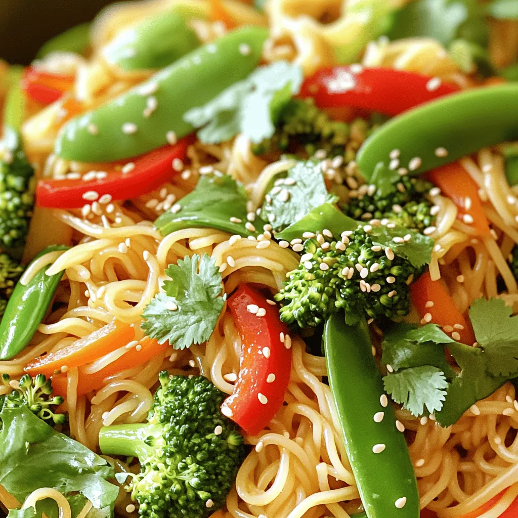 - 8 ounces rice noodles - 2 tablespoons sesame oil - 1 tablespoon fresh ginger, minced - 3 garlic cloves, minced - 1 red bell pepper, sliced - 1 cup broccoli florets - 1 cup snap peas - 1 carrot, julienned - 4 green onions, chopped - 1/4 cup soy sauce (or tamari for gluten-free) - 2 tablespoons rice vinegar - 1 tablespoon honey or maple syrup - Sesame seeds for garnish - Fresh cilantro for garnish (optional) - Salt and pepper to taste When I create a dish, I focus on fresh ingredients. For this stir fry, rice noodles serve as a great base. They soak up flavors well. Sesame oil brings a rich taste that I love. Fresh ginger adds warmth and spice, while garlic gives a nice kick. I enjoy adding colorful veggies. Red bell pepper adds sweetness, and broccoli adds crunch. Snap peas bring a fresh snap, and carrots add color and texture. Green onions finish the dish with a mild onion flavor. For the sauce, I mix soy sauce and rice vinegar. Honey or maple syrup balances the saltiness. The sesame seeds on top give a nice crunch. Fresh cilantro adds a pop of color and flavor. Use salt and pepper to taste for the perfect finish. Start by boiling a large pot of water. Add 8 ounces of rice noodles. Cook them until they are al dente. This usually takes about 5 to 7 minutes. Drain the noodles and set them aside for later. In a small bowl, mix together the sauce. Combine 1/4 cup of soy sauce, 2 tablespoons of rice vinegar, and 1 tablespoon of honey or maple syrup. Add a pinch of black pepper for extra flavor. Whisk until it’s well blended, then set it aside. Heat 2 tablespoons of sesame oil in a large skillet or wok over medium-high heat. Once hot, add 1 tablespoon of minced ginger and 3 minced garlic cloves. Stir them for about 30 seconds. This will make your kitchen smell amazing! Now, add the fun part! Toss in 1 sliced red bell pepper, 1 cup of broccoli florets, 1 cup of snap peas, and 1 julienned carrot. Stir-fry these for 4 to 5 minutes. You want them to be tender but still crisp. Next, it's time to unite the flavors. Add the cooked rice noodles to the skillet with the vegetables. Pour in the sauce you made earlier. Toss everything together gently. Make sure all the noodles and veggies are coated in that tasty sauce. Sprinkle in 4 chopped green onions. Toss again to mix them in well. Cook for an additional 1 to 2 minutes. This will help heat everything through and blend the flavors. Finally, transfer the stir-fry to serving bowls. Top with sesame seeds for crunch. If you like, add fresh cilantro as a garnish. Enjoy your delicious meal! To cook rice noodles just right, follow these steps: - Boil a big pot of water. - Add the rice noodles. - Cook until they are al dente. This usually takes around 5 to 7 minutes. - Drain the noodles and rinse them in cold water. This stops the cooking. This method keeps the noodles from becoming too soft. Perfect noodles give the dish a nice texture. If you want to mix up the flavor, try these ideas: - Use tamari instead of soy sauce for a gluten-free option. - Swap rice vinegar for apple cider vinegar for a different zing. - Add a splash of lime juice for brightness. - Experiment with different sweeteners like agave or coconut sugar. Each change can totally change the taste of your dish. Be creative and find what you love! Stir-frying is all about speed and heat. Here are my best tips: - Heat the pan well before adding oil. This helps cook food fast. - Cut all veggies the same size for even cooking. - Keep stirring! This avoids burning and helps things cook evenly. - Don’t overcrowd the pan. If needed, cook in batches. These tips help you get that perfect stir-fry every time. A hot, fast cook brings out great flavors and colors! {{image_2}} You can easily add protein to your Sesame Ginger Noodle Stir Fry. Chicken, shrimp, and tofu are great choices. - Chicken: Use thinly sliced chicken breast. Cook it before adding the veggies. This will give you a hearty meal. - Tofu: Firm tofu works well. Press it to remove excess water, then cube it. Sauté until golden for a nice texture. - Shrimp: Shrimp cooks quickly. Add it after the garlic and ginger for the best flavor and cook until pink. Each option adds its flavor and texture to the dish. For a vegan dish, simply skip the honey and use maple syrup. Tamari is a perfect soy sauce alternative for gluten-free diets. Always check labels when buying sauces to ensure they are gluten-free. This way, everyone can enjoy the meal without worry. You can change the vegetables based on what you have. Here are some ideas: - Zucchini: Slice it thinly and stir-fry for a fresh taste. - Bell Peppers: Use yellow or green peppers for color and flavor. - Spinach: Add fresh spinach at the end. It wilts quickly and adds nutrients. These swaps keep the dish exciting and fresh each time you make it. To keep your Sesame Ginger Noodle Stir Fry fresh, place it in an airtight container. Make sure it cools down before sealing. Store it in the fridge. It stays good for about 3 to 4 days. If you want to enjoy it later, you can freeze it. When you're ready to eat your leftovers, use the microwave or a pan. If using the microwave, heat in short bursts. Stir in between to ensure even heat. If using a pan, add a splash of water or broth to keep it moist. Heat over medium until hot. To freeze the stir fry, let it cool completely first. Then, place it in a freezer-safe container or bag. Press out the air to prevent freezer burn. It will last for about 2 months in the freezer. When you're ready to eat, thaw it overnight in the fridge before reheating. For this dish, I recommend using rice noodles. They are soft and soak up the sauce well. Rice noodles cook quickly and provide a nice texture. You can also use egg noodles if you prefer. Just make sure to adjust cooking times based on the type you choose. Yes, you can prepare this dish ahead of time. Cook the noodles and veggies, then store them in separate containers. Mix them just before serving. This way, you