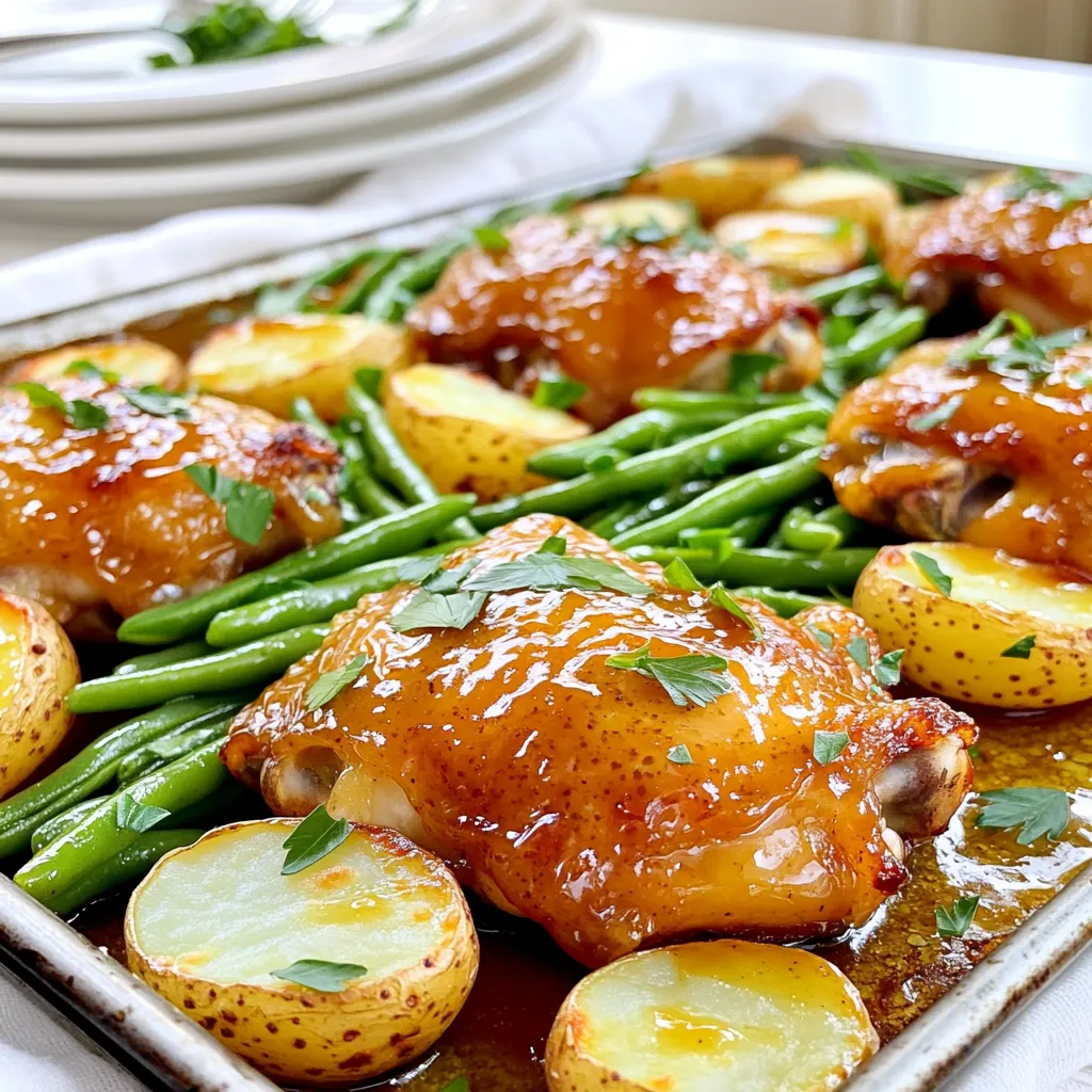 On a large sheet pan, spread out 2 cups of halved baby potatoes and 1 cup of trimmed green beans. Drizzle with olive oil and season with salt and pepper. Toss them to coat evenly. Then, nestle the marinated chicken thighs among the veggies.