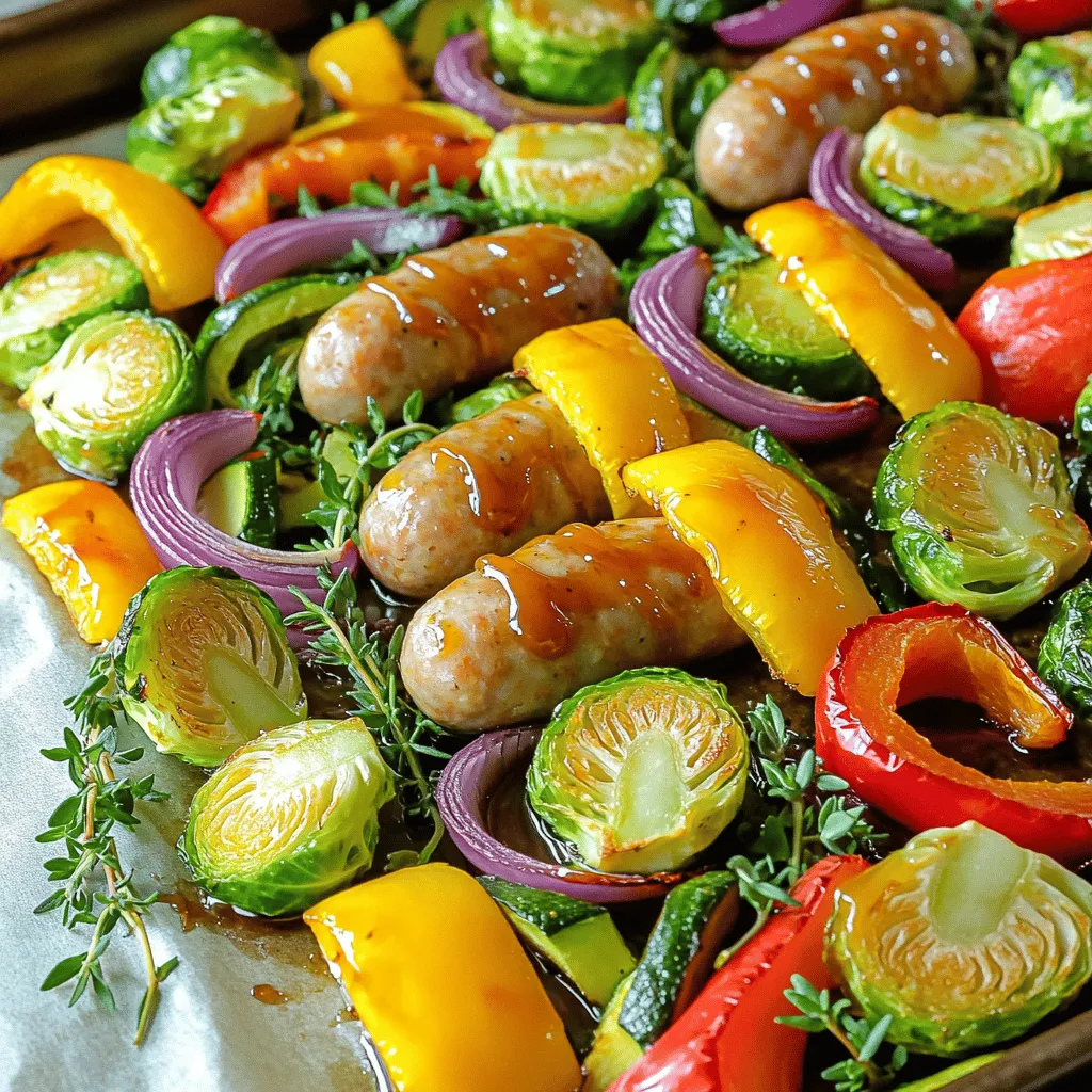 Start by gathering all your ingredients. You will need chicken sausages, Brussels sprouts, bell pepper, zucchini, red onion, olive oil, maple syrup, garlic, thyme, smoked paprika, salt, and pepper. Preheat your oven to 425°F (220°C). Line a large baking sheet with parchment paper. This makes cleanup easy later.