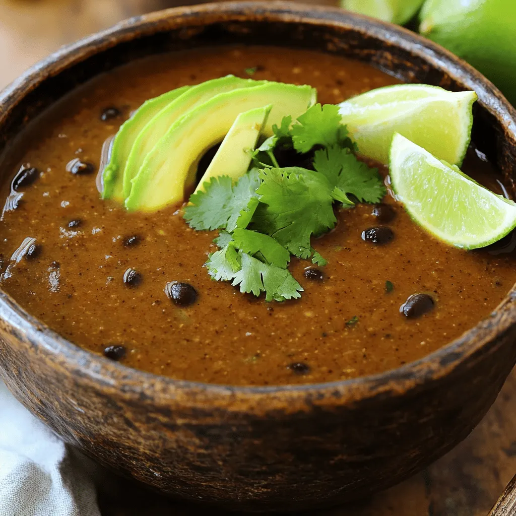 To make Spicy Black Bean Soup, gather these main ingredients: - 2 cans (15 oz each) black beans, drained and rinsed - 1 medium onion, diced - 2 cloves garlic, minced - 1 red bell pepper, diced - 1 jalapeño, finely chopped (seeds removed for less heat) - 1 can (14 oz) diced tomatoes with green chilies - 4 cups vegetable broth - 1 tablespoon olive oil - 1 teaspoon ground cumin - 1 teaspoon smoked paprika - Salt and pepper to taste These ingredients create a rich and hearty base for your soup. Black beans add protein and fiber. The onion and garlic provide depth of flavor. The bell pepper and jalapeño add texture and spice. You can enhance your soup with these tasty toppings: - Fresh cilantro, for garnish - Avocado slices, for topping - Lime wedges, for serving These toppings add freshness and a burst of flavor. Cilantro brings a bright note, while avocado adds creaminess. Lime juice adds a zesty kick that complements the spices. Using a good-quality vegetable broth boosts the soup's flavor. You can choose low-sodium broth to control salt levels. For spices, stick to ground cumin and smoked paprika for warmth. If you like heat, feel free to add hot sauce. Each ingredient plays a role in making your soup flavorful and satisfying. Start by heating olive oil in a large pot over medium heat. Add the diced onion and cook for about 5 minutes. Stir until the onion turns translucent. Then, mix in the minced garlic, diced red bell pepper, and finely chopped jalapeño. Cook for another 2-3 minutes until the veggies soften. Next, sprinkle in the ground cumin and smoked paprika. Stir well to coat the vegetables. Cook this for about 1 minute. The spices will become fragrant and lift the dish's flavor. Now, add the canned black beans and the diced tomatoes with their juices. Pour in 4 cups of vegetable broth. Stir everything together and bring the mixture to a gentle boil. Reduce the heat to low and cover the pot. Let the soup simmer for 20-25 minutes. This allows the flavors to meld together, creating a rich and tasty soup. For a creamy soup, use an immersion blender. Blend about half of the soup right in the pot. If you don't have an immersion blender, carefully transfer half of the soup to a blender. Blend until smooth and pour it back into the pot. Taste the soup now. Adjust the seasoning by adding salt and pepper as needed. If you like it spicier, add a dash of hot sauce for extra heat. Ladle the soup into bowls. Top each bowl with fresh avocado slices and chopped cilantro. Serve with lime wedges on the side. The lime adds a nice zing that brightens the flavors. Enjoy your delicious Spicy Black Bean Soup! To control the heat in your spicy black bean soup, adjust the jalapeño. Remove the seeds for less heat or keep them for more. You can also add hot sauce during cooking to spice it up. Start with a small amount, then add more to taste. Always remember, you can add heat, but you cannot take it away! You will need some basic kitchen tools for this recipe. Here’s what I recommend: - A large pot for cooking the soup - A cutting board and knife for chopping veggies - A wooden spoon for stirring - An immersion blender for a creamy texture (optional) - Measuring cups and spoons for accurate ingredients Want to save time? Use canned black beans to skip cooking them from scratch. Pre-chopped veggies are also a great option if you’re in a hurry. You can prepare the soup in just 30 minutes! For even quicker meals, make a big batch and freeze leftovers for later. {{image_2}} You can easily make this soup vegetarian or vegan. The base is already plant-based. Just use vegetable broth and skip any meat toppings. This way, everyone can enjoy it. Feel free to swap ingredients based on your needs. If you don’t like black beans, try pinto or kidney beans. Prefer a different pepper? Use green bell pepper or poblano for a milder taste. You can also add corn for some sweetness. Adjust the heat to fit your taste. If you like it mild, remove the jalapeño seeds. For more kick, add extra jalapeños or a pinch of cayenne pepper. You can also toss in some chili powder for an added layer of flavor. After enjoying your spicy black bean soup, let it cool completely. Then, pour it into an airtight container. Make sure to seal it well. Store the soup in the fridge. It can last for about 3 to 4 days. When you are ready to enjoy your leftovers, take the soup out of the fridge. Pour it into a pot. Heat it over medium heat. Stir it often to warm it evenly. You can also use a microwave. Place the soup in a microwave-safe bowl. Heat it in short bursts, stirring in between. If you want to keep the soup for a longer time, freezing is a great option. First, let the soup cool. Then, pour it into freezer-safe bags or containers. Leave some space at the top for expansion. Label the bags with the date. You can freeze the soup for up to 3 months. When ready to eat, thaw it in the fridge overnight before reheating. Black beans are full of fiber, which helps digestion. They are also high in protein, making them great for energy. These beans contain iron, which is good for blood health. Plus, they have antioxidants that fight free radicals. Eating black beans can help keep your heart healthy too. Yes, you can make this soup ahead of time. It actually tastes better the next day. Store it in the fridge for up to three days. Just reheat it on the stove when you're ready to eat. To make more soup, simply double the recipe. Use four cans of black beans and eight cups of broth. Adjust the spices and veggies to taste. This way, you can feed a crowd easily. Yes, you can use low-sodium vegetable broth. Also, rinse the beans well to reduce sodium. This keeps the soup healthy without losing flavor. To make it spicier, add more jalapeño or hot sauce. You can also use spicy diced tomatoes. For a milder soup, leave out the jalapeño seeds. You can also reduce the amount of spices used. You learned how to make Spicy Black Bean Soup with easy steps and 
