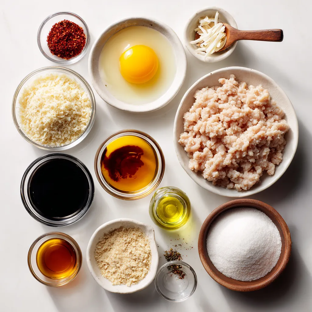 • In a large mixing bowl, combine ground chicken, breadcrumbs, Parmesan cheese, egg, minced garlic, minced ginger, soy sauce, red pepper flakes, salt, and pepper. Mix until well combined.