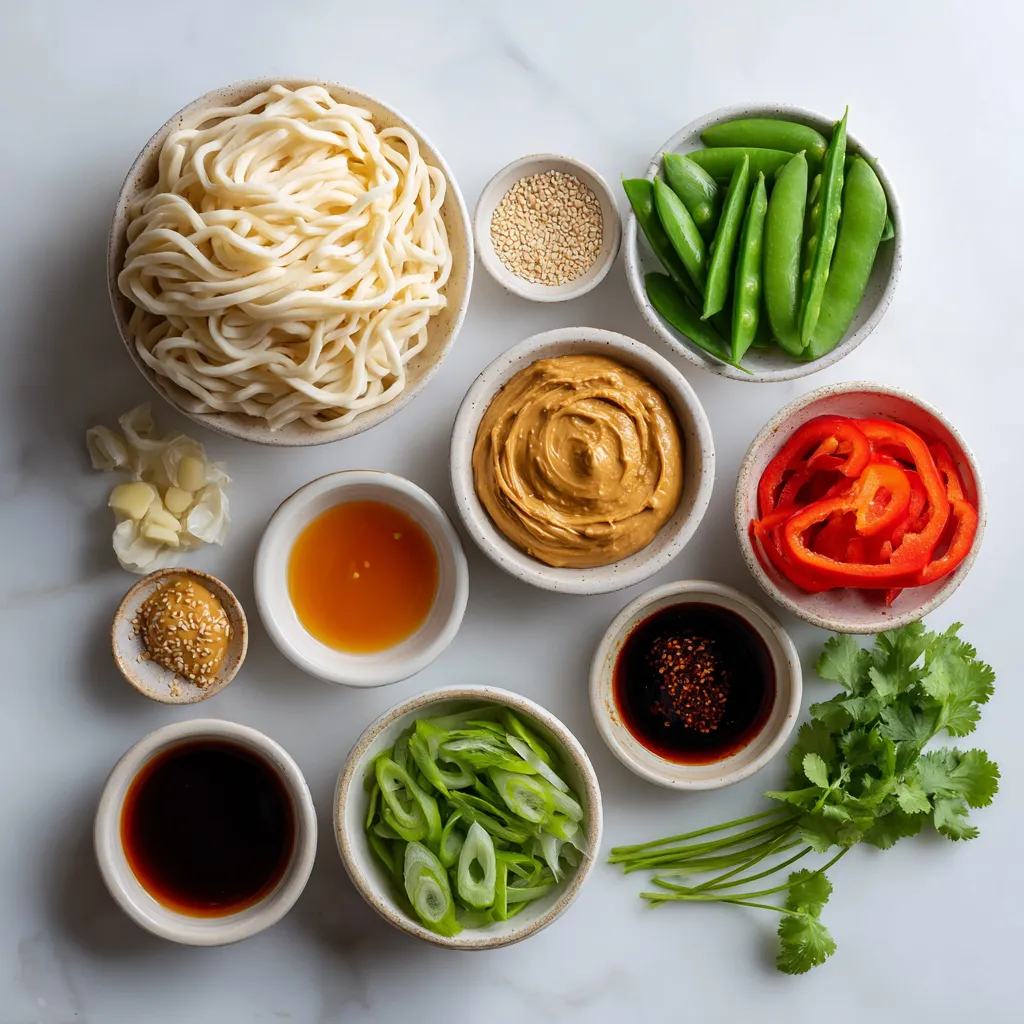 Gather these items before you start cooking. The udon noodles form the base of the dish. The creamy peanut butter gives a rich, nutty flavor. Soy sauce adds saltiness, while rice vinegar brings brightness. Sesame oil enhances the taste with its unique aroma. Sriracha adds heat, so adjust it to your liking.