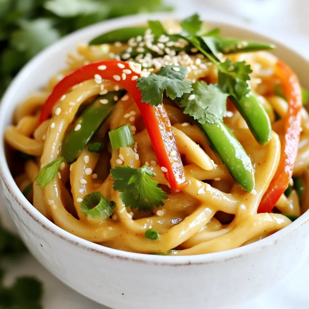 - Udon Noodles and Sauces - 8 oz udon noodles - 1/2 cup creamy peanut butter - 2 tablespoons soy sauce - 1 tablespoon rice vinegar - 1 tablespoon sesame oil - 1 tablespoon sriracha (adjust to taste) - Fresh Vegetables and Garnishes - 1 cup snap peas, trimmed - 1 red bell pepper, thinly sliced - 2 cloves garlic, minced - 1-inch piece of ginger, grated - 1 green onion, sliced (for garnish) - 1 tablespoon toasted sesame seeds (for garnish) - Fresh cilantro leaves (for garnish) - Optional Sweeteners - 1 tablespoon honey or maple syrup Gather these items before you start cooking. The udon noodles form the base of the dish. The creamy peanut butter gives a rich, nutty flavor. Soy sauce adds saltiness, while rice vinegar brings brightness. Sesame oil enhances the taste with its unique aroma. Sriracha adds heat, so adjust it to your liking. For veggies, snap peas and red bell pepper add crunch and color. Garlic and ginger give depth to the sauce. Green onions, sesame seeds, and cilantro offer fresh garnishes that make the dish pop. If you like a hint of sweetness, include honey or maple syrup. This blend of ingredients creates a delightful mix of flavors and textures. Enjoy making this dish! {{ingredient_image_1}} Start by boiling water in a large pot. Once boiling, add the udon noodles. Cook them according to the package instructions, usually around 8-10 minutes. When they are soft, drain the noodles and rinse them under cold water. This stops the cooking and keeps them from sticking. Set the noodles aside while you prepare the sauce. In a mixing bowl, measure out the creamy peanut butter and add it. Next, pour in the soy sauce, rice vinegar, and sesame oil. Add the sriracha, honey, minced garlic, and grated ginger. Whisk everything together until smooth. If your sauce is too thick, add a little warm water to make it easier to mix. This sauce packs a punch with flavor and spice! Heat a skillet over medium heat and add the snap peas and red bell pepper. Sauté these for about 3-4 minutes. You want them to be tender-crisp, so don’t overcook them. The bright colors add a fun look to your dish! Now, it’s time to bring everything together. Add the cooked udon noodles to the skillet with the sautéed vegetables. Pour the peanut sauce over the noodles. Gently toss everything together until the noodles and veggies are well coated. Cook for another 2-3 minutes to heat everything through. Once done, transfer the spicy peanut udon noodles to a serving dish. Garnish with sliced green onion, toasted sesame seeds, and fresh cilantro leaves. Enjoy this tasty dish! To get the best texture in your noodles, cook them just right. Follow the package instructions for the udon noodles. Don't overcook them! After cooking, rinse the noodles under cold water. This helps stop the cooking process and keeps them firm. When you sauté them with the veggies, they will soak up the sauce but stay nice and chewy. If you want more heat, add extra sriracha to the peanut sauce. Start with one tablespoon and taste. You can always add more later. If it’s too spicy, balance it with honey or maple syrup. This will sweeten the dish and tone down the heat. Remember, you control the spice! One common mistake is not rinsing the noodles after cooking. This can make them sticky and mushy. Another mistake is adding the sauce too soon. Wait until you sauté the veggies. Mixing them too early can make the noodles clump together. Lastly, don’t skip the garnishes. They add flavor and make your dish look great! Pro Tips Adjust the Spice Level: Feel free to modify the amount of sriracha to suit your heat preference. Start with less and add more as needed. Veggie Variations: Experiment with other vegetables like broccoli, carrots, or bell peppers for added color and nutrition. Make Ahead: The peanut sauce can be made in advance and stored in the refrigerator for up to a week. Just give it a good stir before using. Serving Suggestions: These noodles pair well with grilled chicken, shrimp, or tofu for an extra protein boost. {{image_2}} You can add protein to make your spicy peanut udon noodles more filling. Chicken is a great choice. Use grilled or sautéed chicken for a tasty boost. Tofu works well too. Choose firm tofu, press it, and cube it before cooking. Shrimp is another option. Sauté shrimp until they turn pink and add them to the dish. Each protein adds its own flavor and texture. To keep your dish vegetarian or vegan, use tofu or skip the meat entirely. The peanut sauce is already plant-based. You can also add more vegetables for a hearty meal. Try mushrooms, carrots, or zucchini. These veggies can add crunch and color. Feel free to switch up the vegetables. Broccoli, bell peppers, and bok choy work great in this dish. They add nutrients and flavor. You can also play with spices. Try adding lime juice for a zesty kick or coconut milk for creaminess. Each change adds a new twist to this easy recipe. Enjoy experimenting to find your favorite combination! After you make your spicy peanut udon noodles, you might have some left. To store them, let the noodles cool down first. Then, place them in an airtight container. Keep the container in the fridge. The noodles can last for about three days. If you want to keep them fresh longer, store the sauce separately. This keeps the noodles from getting too soggy. When you're ready to enjoy the leftovers, you can reheat them easily. Place the noodles in a skillet over medium heat. Add a splash of water or a little oil to help them heat up. Stir gently until they are hot. You can also use the microwave. Put the noodles in a bowl and cover them with a damp paper towel. Heat for about one to two minutes, stirring halfway through. Freezing is a great option if you want to save your spicy peanut udon noodles for later. First, let them cool completely. Then, put the noodles in a freezer-safe bag. Try to remove as much air as possible before sealing the bag. You can freeze them for up to three months.