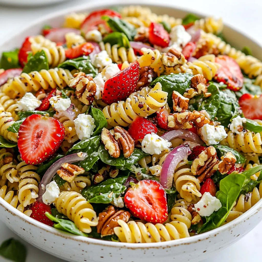 A refreshing pasta salad with strawberries, spinach, and feta, perfect for warm weather.