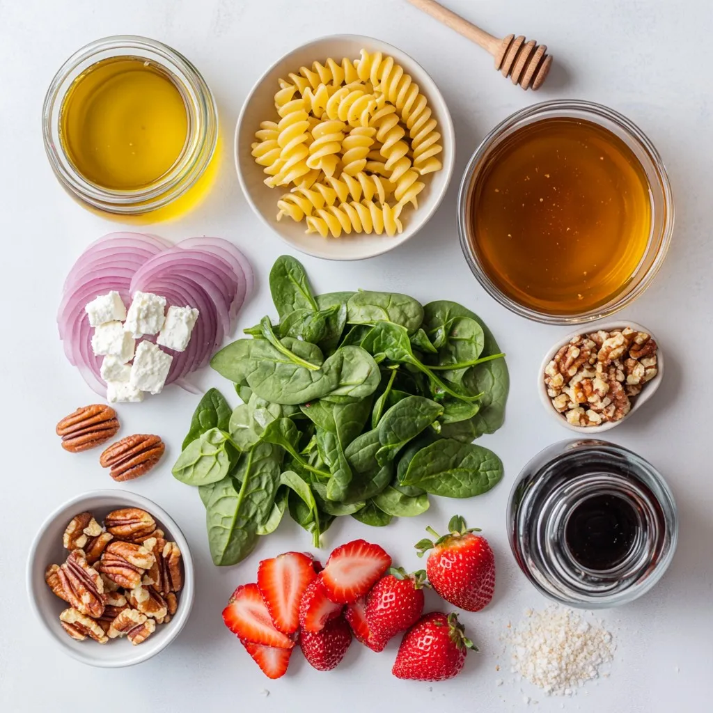 To make a tasty Strawberry Spinach Pasta Salad, you need fresh and simple ingredients. Here’s what you’ll need: