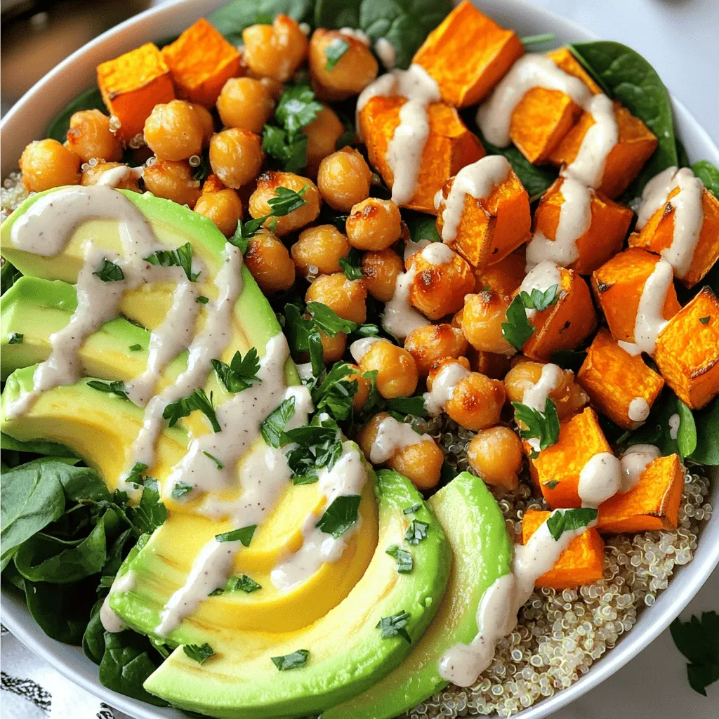 To make your Sweet Potato Chickpea Buddha Bowl, you will need the following ingredients: - 1 large sweet potato, peeled and diced - 1 can (15 oz) chickpeas, drained and rinsed - 2 cups cooked quinoa - 1 cup baby spinach - 1 avocado, sliced - 2 tablespoons olive oil - 1 teaspoon smoked paprika - 1 teaspoon cumin - Salt and pepper to taste - 2 tablespoons tahini - 1 tablespoon lemon juice - Chopped fresh parsley for garnish You can enhance your Buddha Bowl with these tasty toppings: - Sliced radishes for crunch - Cherry tomatoes for sweetness - Cucumber slices for freshness - Feta cheese for a creamy touch - Nuts or seeds for added texture This bowl is a powerhouse of nutrients. Here's why each key ingredient is a winner: - Sweet Potatoes: They are high in fiber and rich in vitamins A and C. - Chickpeas: Packed with protein and iron, they help keep you full. - Quinoa: A complete protein, it contains all nine essential amino acids. - Spinach: This leafy green is full of iron, calcium, and vitamins. - Avocado: Full of healthy fats, it supports heart health. This combination gives you a balanced meal that fuels your body well. First, you will want to prep your ingredients. Start by peeling the large sweet potato. Once peeled, dice it into small cubes. This helps them cook evenly. Next, grab your can of chickpeas. Drain them in a colander and rinse them under cold water. This removes extra salt and preserves their flavor. Lastly, gather your other ingredients, like quinoa, spinach, avocado, and spices. Having everything ready makes cooking easier and faster. To cook the sweet potatoes, preheat your oven to 425°F (220°C). In a large bowl, toss the diced sweet potatoes with 1 tablespoon of olive oil. Add the smoked paprika, cumin, salt, and pepper. Mix well to coat every piece. Spread the sweet potatoes on a baking sheet in a single layer. Roast them for 25-30 minutes. Flip them halfway through to ensure even cooking. They should come out tender and slightly caramelized. While the sweet potatoes are roasting, heat a pan over medium heat. Add 1 tablespoon of olive oil and the rinsed chickpeas. Sprinkle in a pinch of salt and pepper. Sauté the chickpeas for about 5-7 minutes until they turn slightly crispy. This adds a nice texture to your bowl. Now it's time to assemble your Buddha bowl. Start with the cooked quinoa. Divide it among your serving bowls. Next, top each bowl with the roasted sweet potatoes and sautéed chickpeas. Add a handful of fresh baby spinach to each bowl. Then, place a few slices of avocado on top for creaminess. Drizzle the tahini dressing over everything. To make the dressing, whisk together tahini, lemon juice, and water in a small bowl. Finally, garnish with chopped fresh parsley for a pop of color. For a great look, arrange each ingredient neatly to create a colorful display. To get sweet potatoes just right, start by cutting them into even pieces. This helps them cook evenly. Toss the sweet potatoes with olive oil, smoked paprika, cumin, salt, and pepper. Lay them flat on a baking sheet. Roast them at 425°F (220°C) for 25-30 minutes. Flip them halfway to achieve that golden caramelization. For crispy chickpeas, pat them dry after rinsing. Heat olive oil in a pan over medium heat, add the chickpeas, and cook for 5-7 minutes. This will give them a nice crunch. When serving your Buddha bowl, make it colorful and fun. Start with a base of cooked quinoa. Then, add a layer of roasted sweet potatoes and crispy chickpeas. Next, pile on fresh baby spinach and avocado slices. You can sprinkle chopped parsley on top for a fresh touch. Pair your bowl with a side of lemon wedges for an extra zing. You might also enjoy some crusty bread or a light salad with it. While tahini dressing is a star, you can mix it up! Try a yogurt-based dressing for a creamy twist. Combine Greek yogurt, lemon juice, and a pinch of salt for a fresh taste. You can also use a simple vinaigrette. Mix olive oil, lemon juice, salt, and pepper for a tangy option. For a spicy kick, add some sriracha or chili flakes to your tahini. Each dressing brings its own flavor to your Buddha bowl! {{image_2}} You can easily switch ingredients to fit your taste. If you want a different base, use rice or farro instead of quinoa. For a creamy touch, try using roasted butternut squash in place of sweet potatoes. If you're not a fan of chickpeas, swap them for black beans or lentils. These swaps keep the bowl fresh and fun. This Buddha bowl can fit many diets. To make it gluten-free, ensure your grains are certified gluten-free. For nut-free options, check your tahini or try sunflower seed butter instead. If you want a lower-carb meal, replace quinoa with cauliflower rice. These simple changes make the dish suitable for everyone. Want to boost the flavor? Add fresh herbs like cilantro or dill. A sprinkle of feta or goat cheese can give a tangy kick. For a spicy twist, try adding cayenne pepper or red pepper flakes. You can also drizzle some sriracha or a spicy sauce to add heat. Experiment with these flavors to make your bowl truly yours. To keep your Sweet Potato Chickpea Buddha Bowl fresh, store leftovers in an airtight container. Put the bowl in the fridge within two hours after cooking. This helps prevent germs. Keep the quinoa, sweet potatoes, chickpeas, and spinach separate if you can. This way, each part stays fresh longer. You can enjoy your meal for up to three days. When it's time to eat, reheating is easy. Use the microwave for quick warming. Place the quinoa, sweet potatoes, and chickpeas in a bowl. Heat for 1-2 minutes, stirring halfway. This helps them warm evenly. If you prefer the oven, set it to 350°F (175°C). Spread the components on a baking sheet. Bake for about 10-15 minutes. This keeps the texture nice and crispy. You can freeze the components for later meals. First, let them cool completely. Then, put each part in freezer-safe bags. Label the bags with dates. You can freeze them for up to three mont