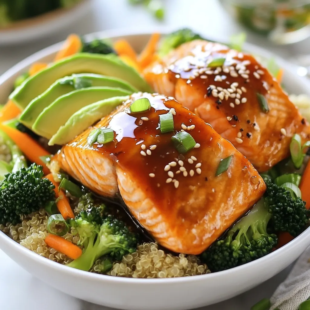 A delicious and healthy bowl featuring marinated salmon, quinoa or brown rice, and fresh vegetables, topped with a savory teriyaki sauce.