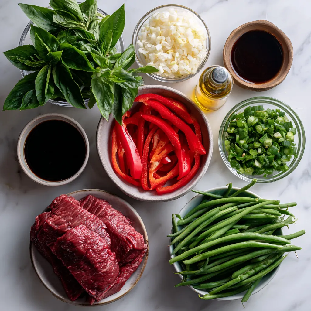 A flavorful and spicy stir fry featuring tender beef, fresh vegetables, and aromatic Thai basil.