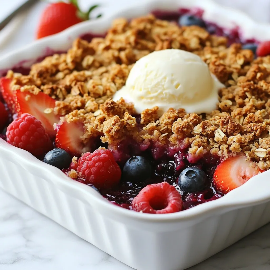 A delightful dessert featuring a mix of strawberries, blueberries, and raspberries topped with a crunchy oat and brown sugar topping.